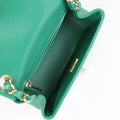 This Mini Square Flap Bag is in Green Lambskin with Gold Hardware, tonal stitching, front flap with CC turnlock closure, half-moon back pocket, and an interwoven green leather and gold chainlink/crossbody strap.