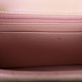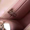 The interior is lined in pink iridescent leather and features a zipper pocket with Chanel pull and an open pocket below.