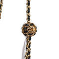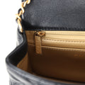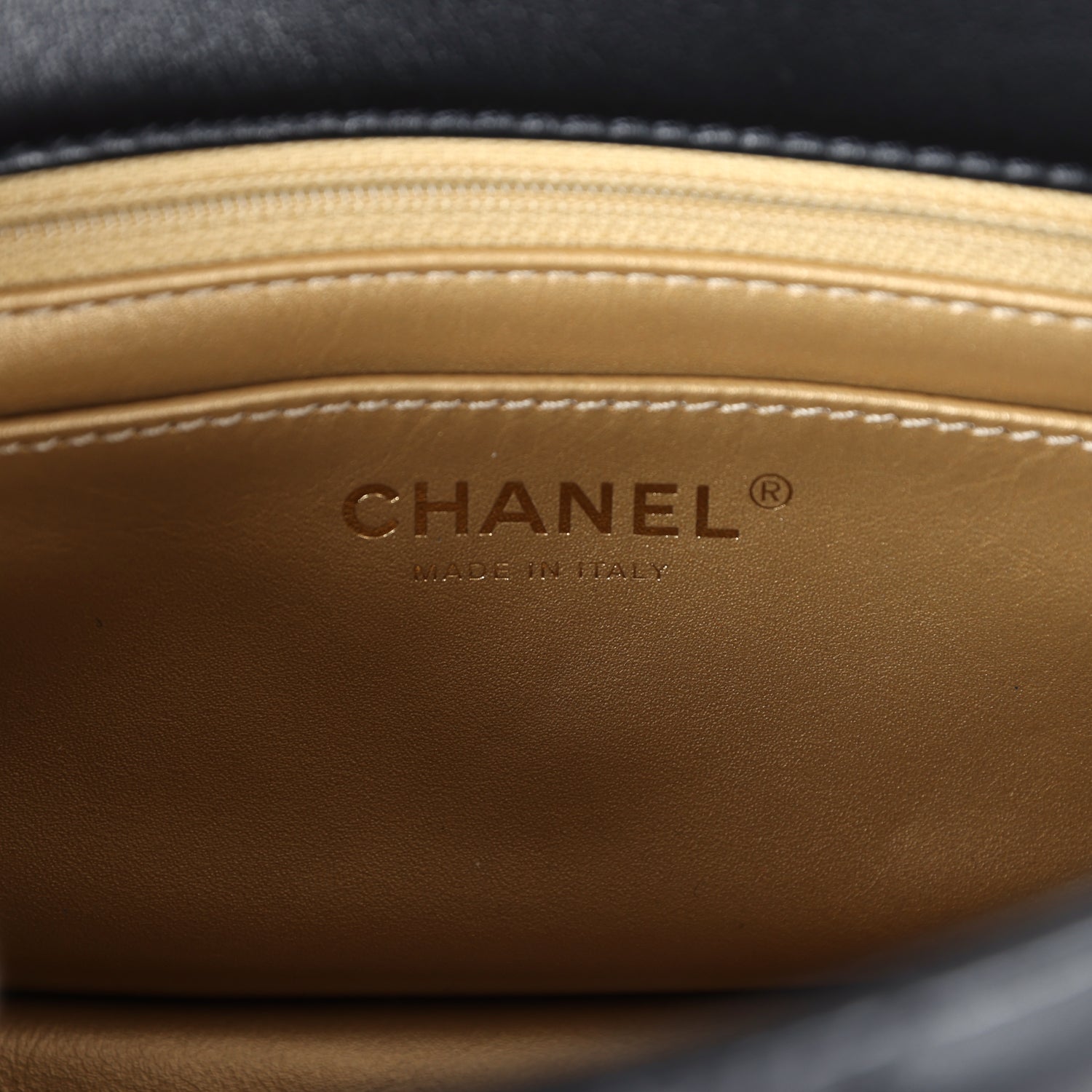 The interior is lined in gold leather and features a zipper pocket with Chanel pull and an open pocket below.
