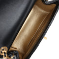This Chanel Mini Square Pearl Crush Flap Bag is of black lambskin leather with antique gold hardware. It has a front flap with signature CC turnlock closure, tonal stitching, rear half moon pocket, a single interwoven black leather and antique gold tone chain link shoulder/crossbody strap and faux pearl top handle strap.