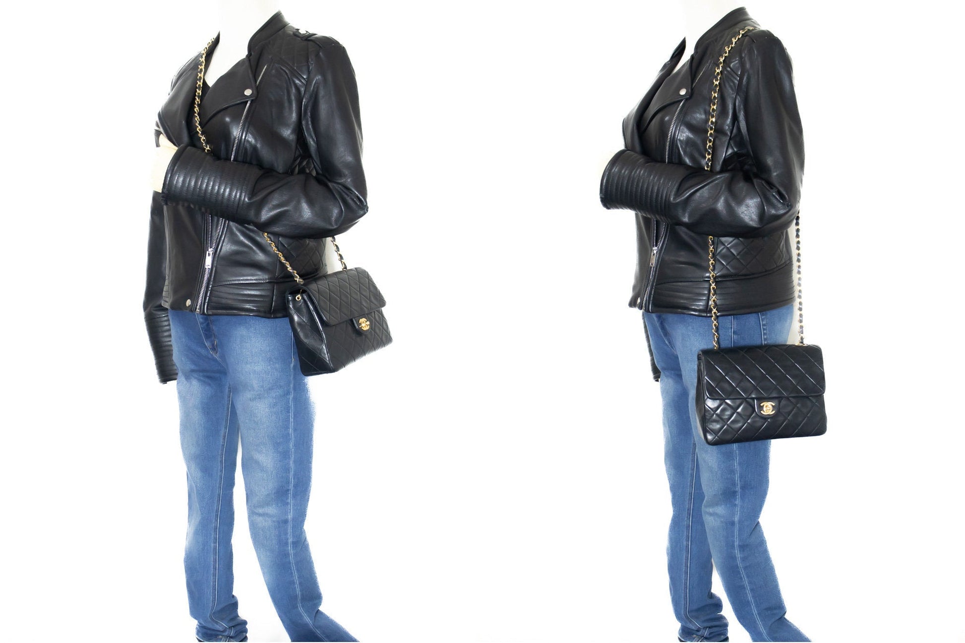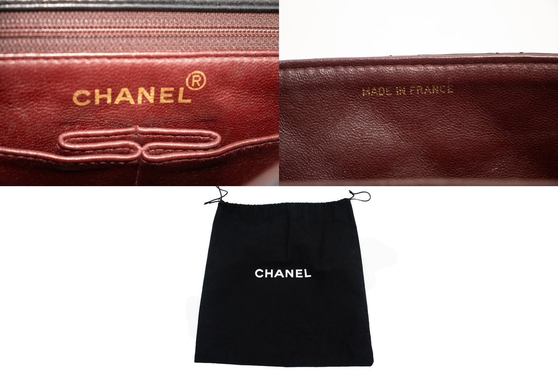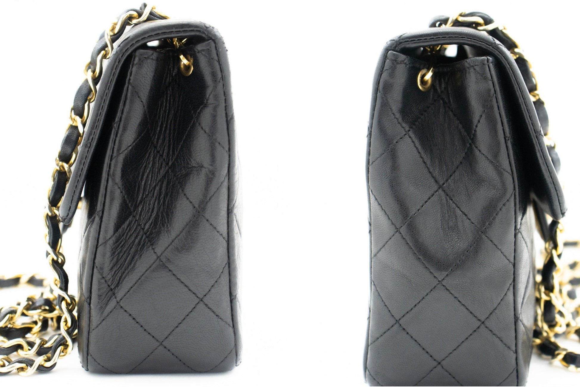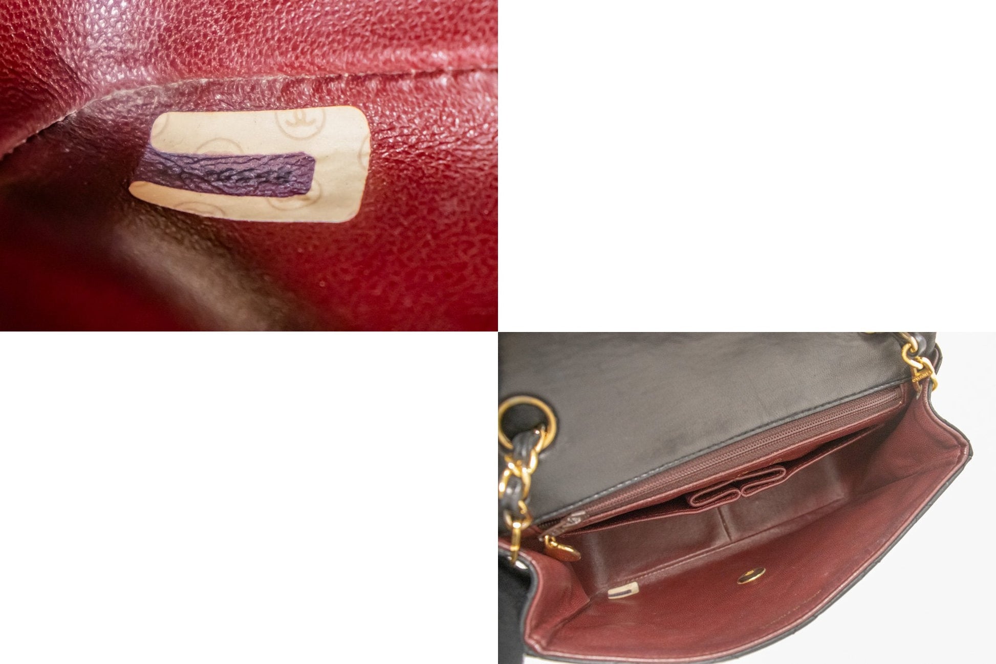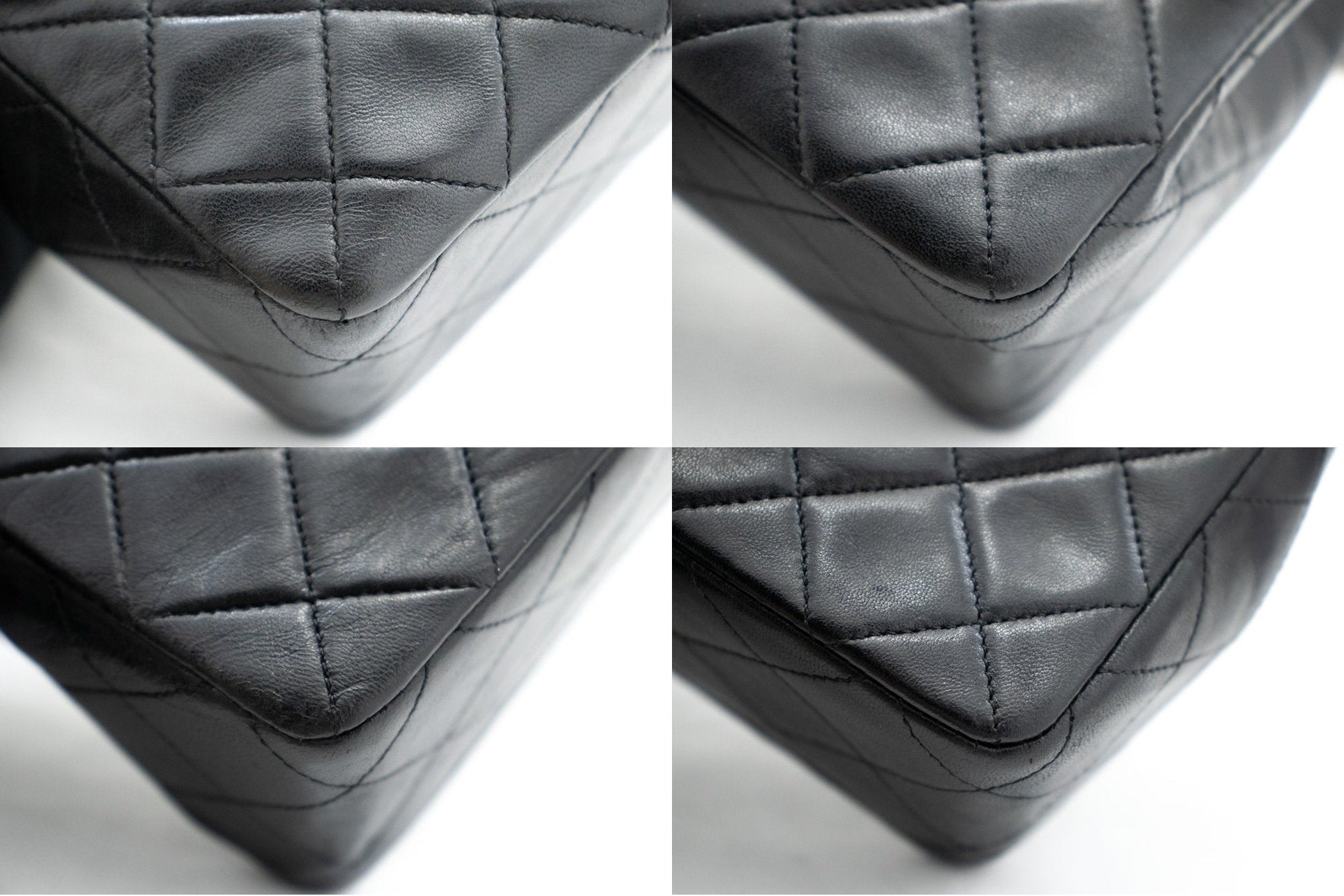 Overall: 8 of 10 - The outside is in excellent condition with minimal signs of use only. The inside is also excellent and very clean with very slight scratches. No stickiness or peeling. All chains and hardware are shiny and excellent. The dust bag is also great. Highly recommended!