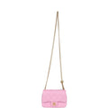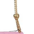 This Mini Sweetheart Crush flap bag is in pink caviar leather with antique gold tone hardware, a front flap with CC turnlock closure, half moon back pocket and an interwoven antique gold tone chain link adjustable crossbody strap with a heart crush stopper.