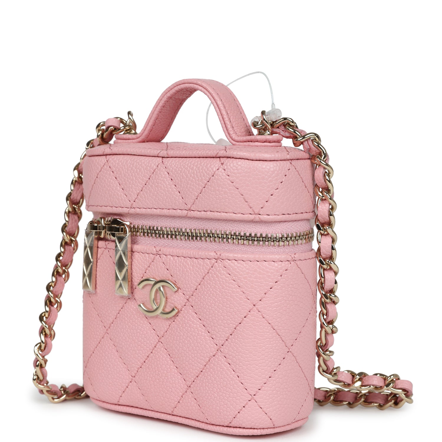 This Chanel mini top handle vanity case in quilted Pink caviar leather with gold tone hardware, features tonal stitching, vertical shaped vanity case Gold tone CC logo on front of vanity case, zip around zipper closure, leather top handle, and a long gold interwoven with pink leather shoulder/crossbody strap.
