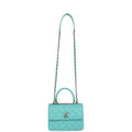 This Mini Trendy CC bag is in Turquoise lambskin leather with light gold tone hardware and has a front flap with signature CC turnlock closure, rear half moon pocket, single interwoven Turquoise leather and light gold tone chain link shoulder/crossbody strap and top handle.