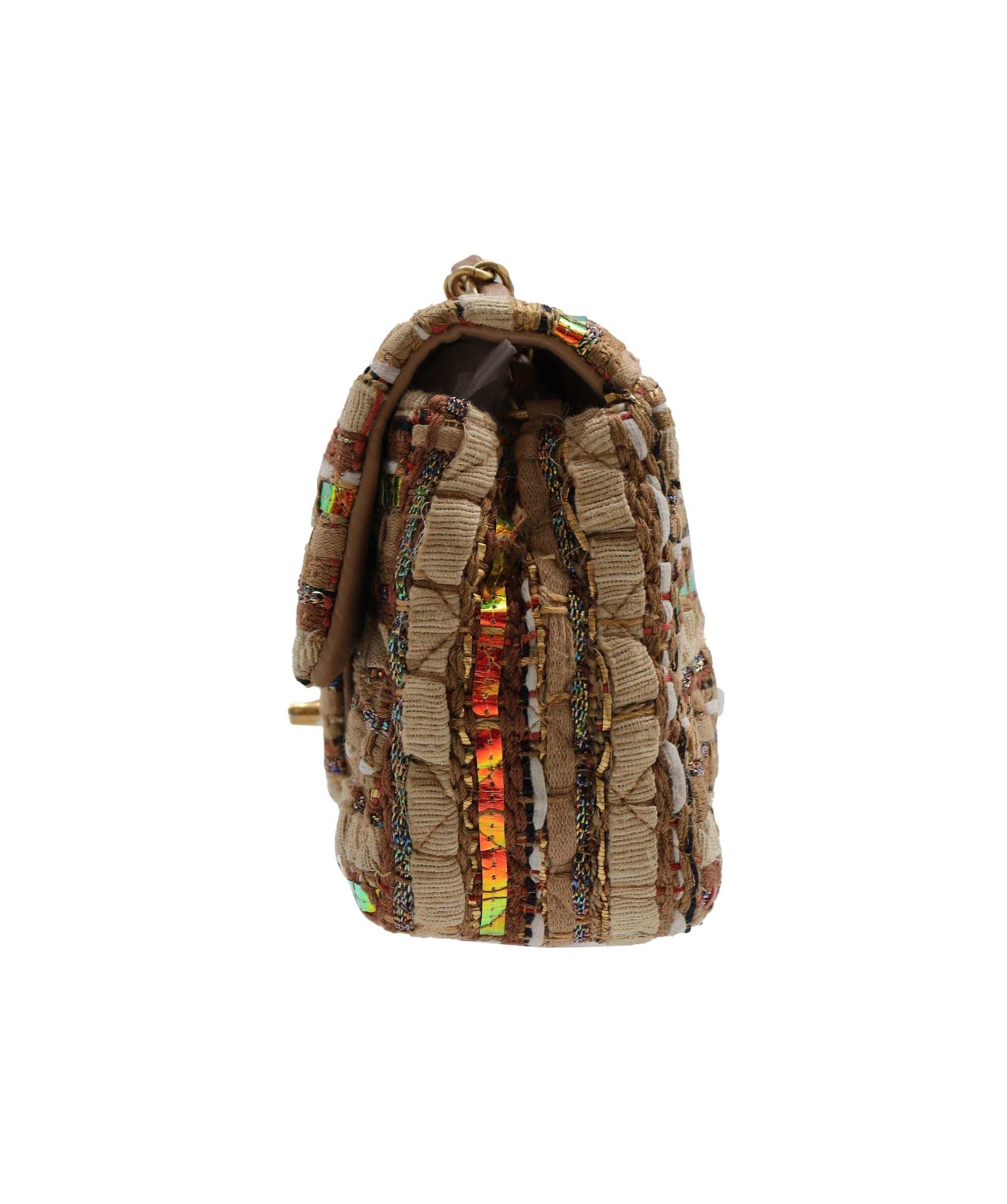Description: Brown, Beige, Metallic Gold and Black Multicolor Quilted Ancient Egyptian Tweed Rectangular Mini Classic Flap Gold Hardware, 2019. The interior is lined in a brown leather and includes .