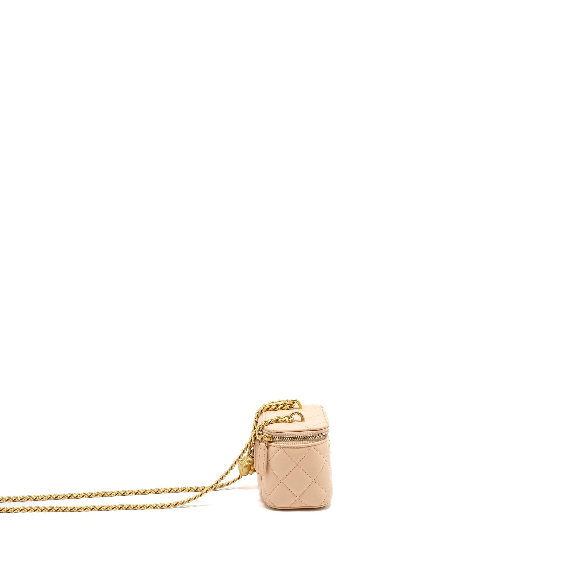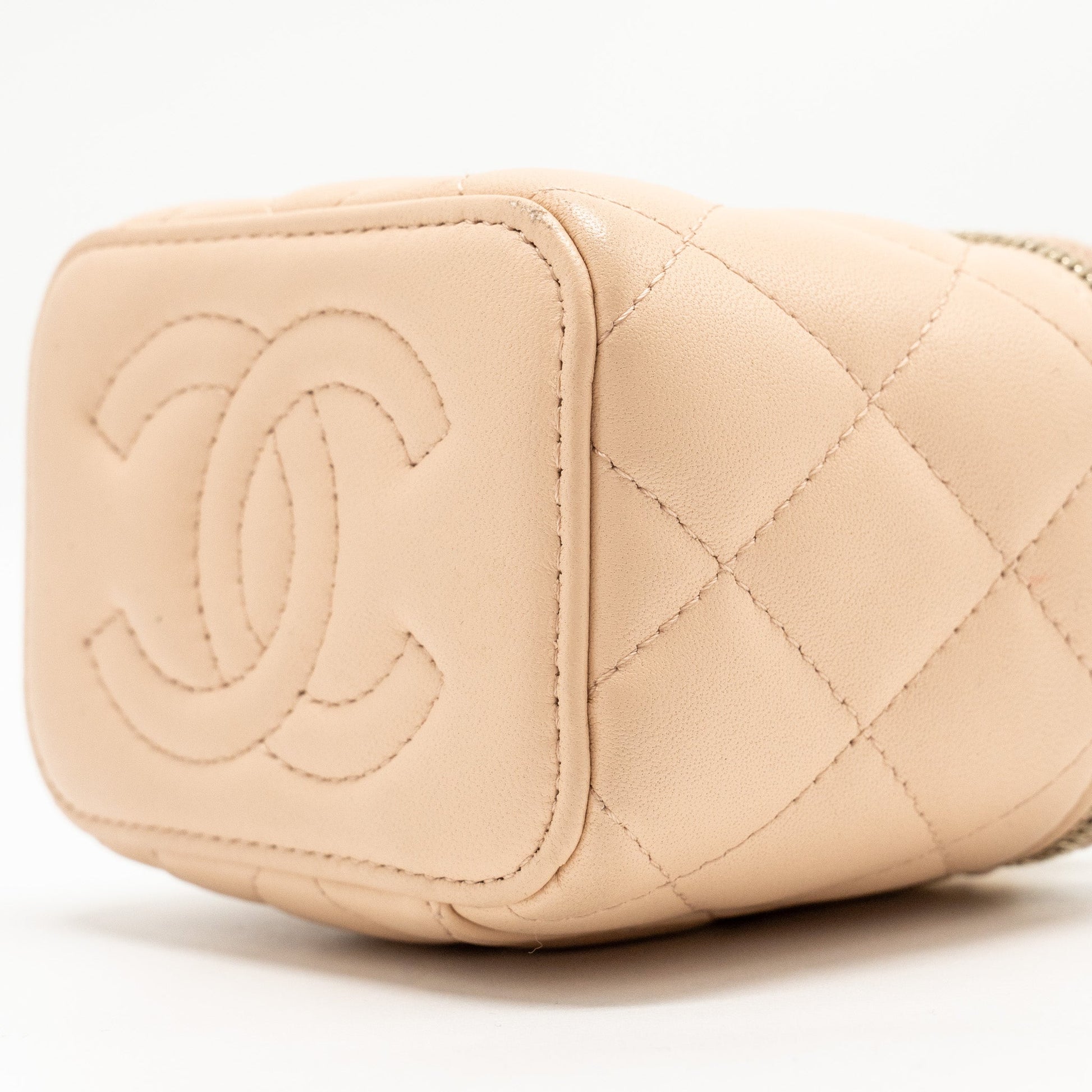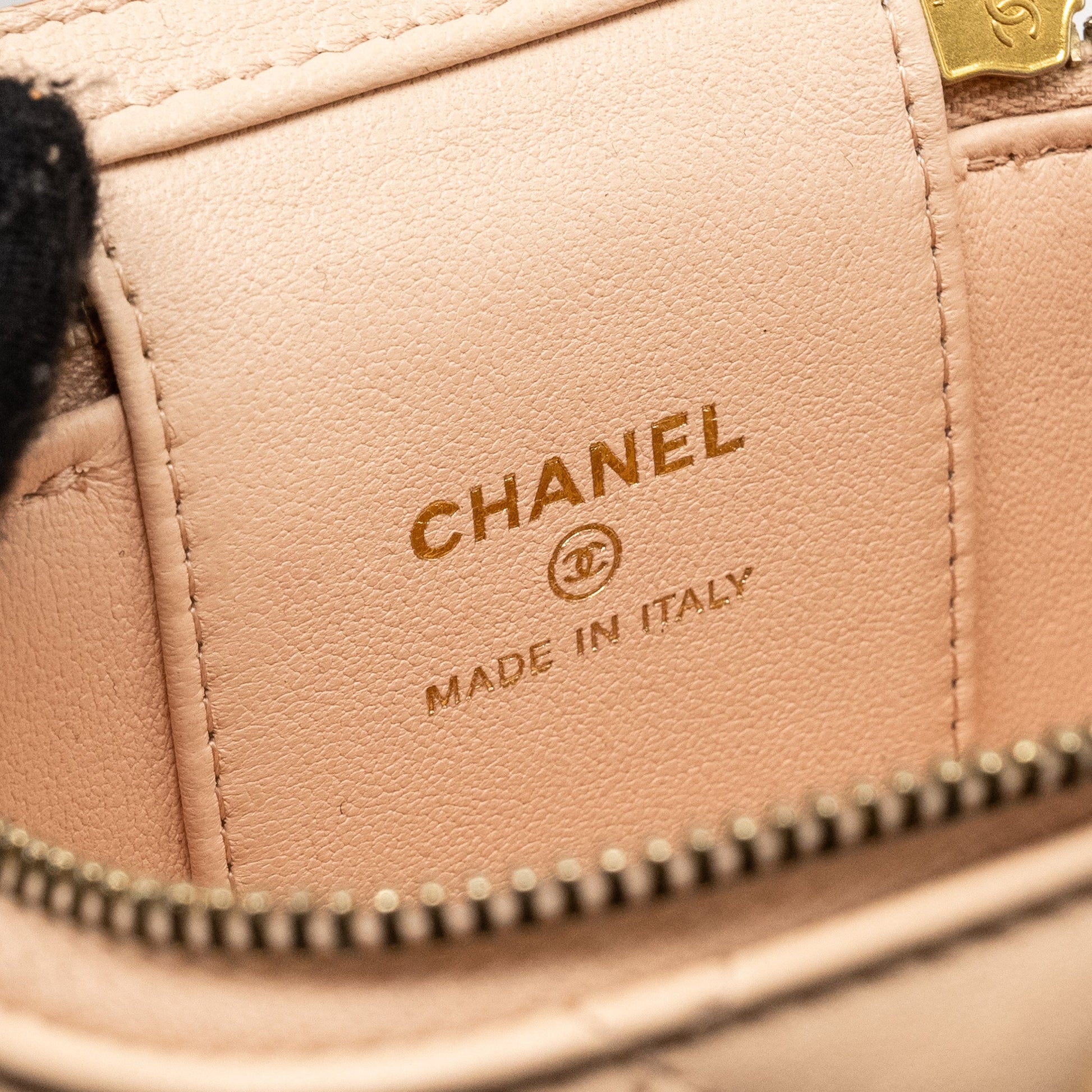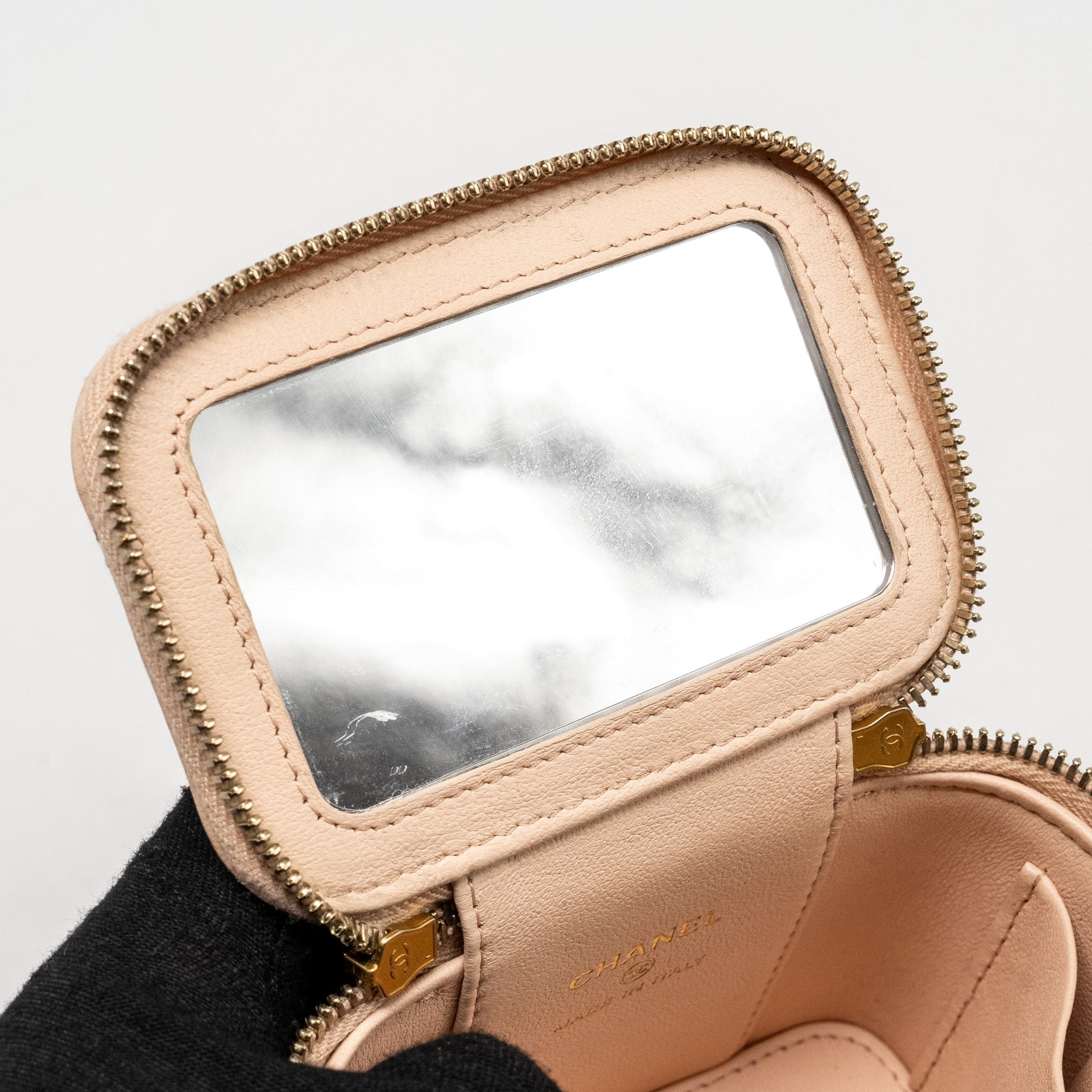 Chanel Mini Vanity Case With Camellia Adjustable Chain Lambskin Beige GHW (Microchip)