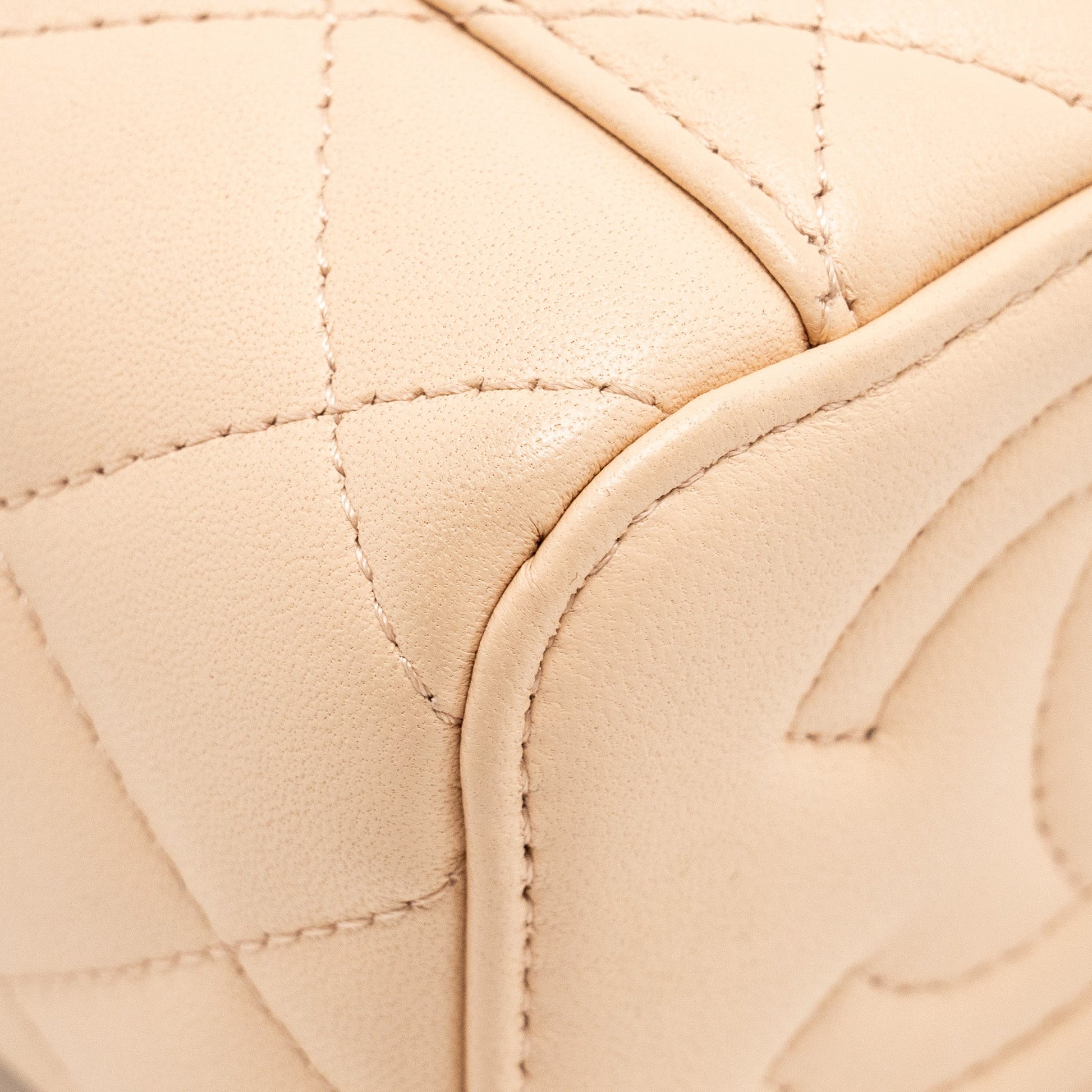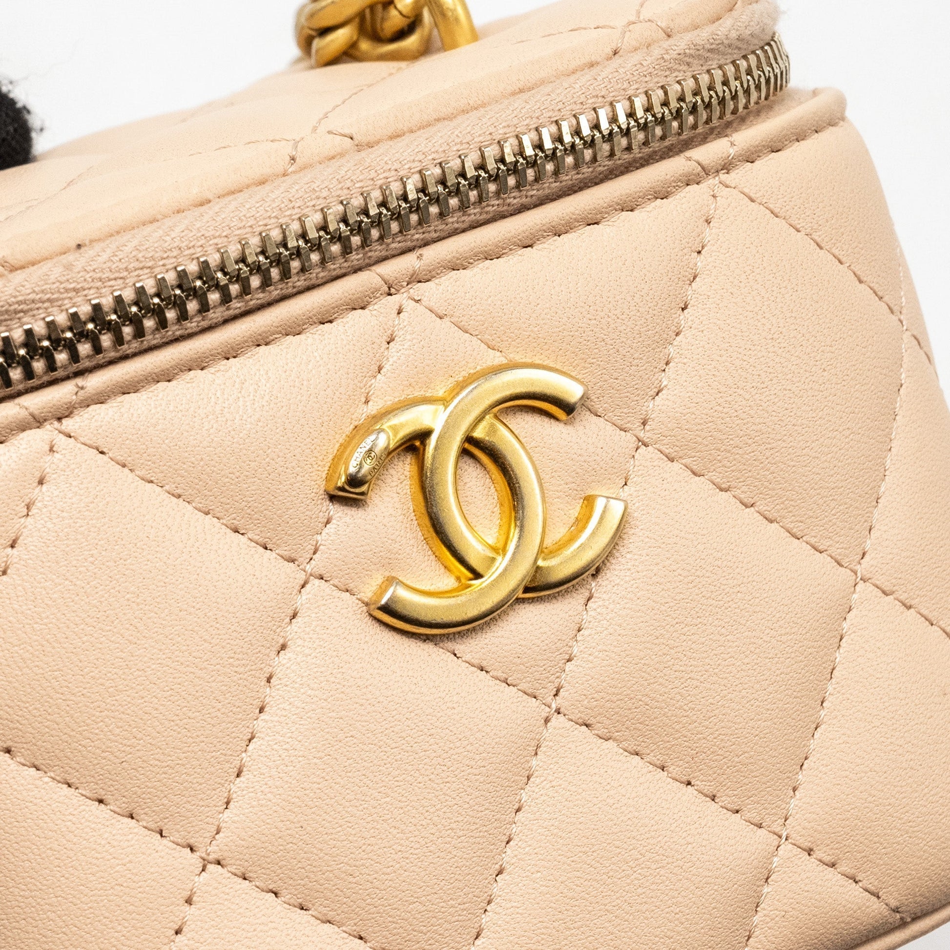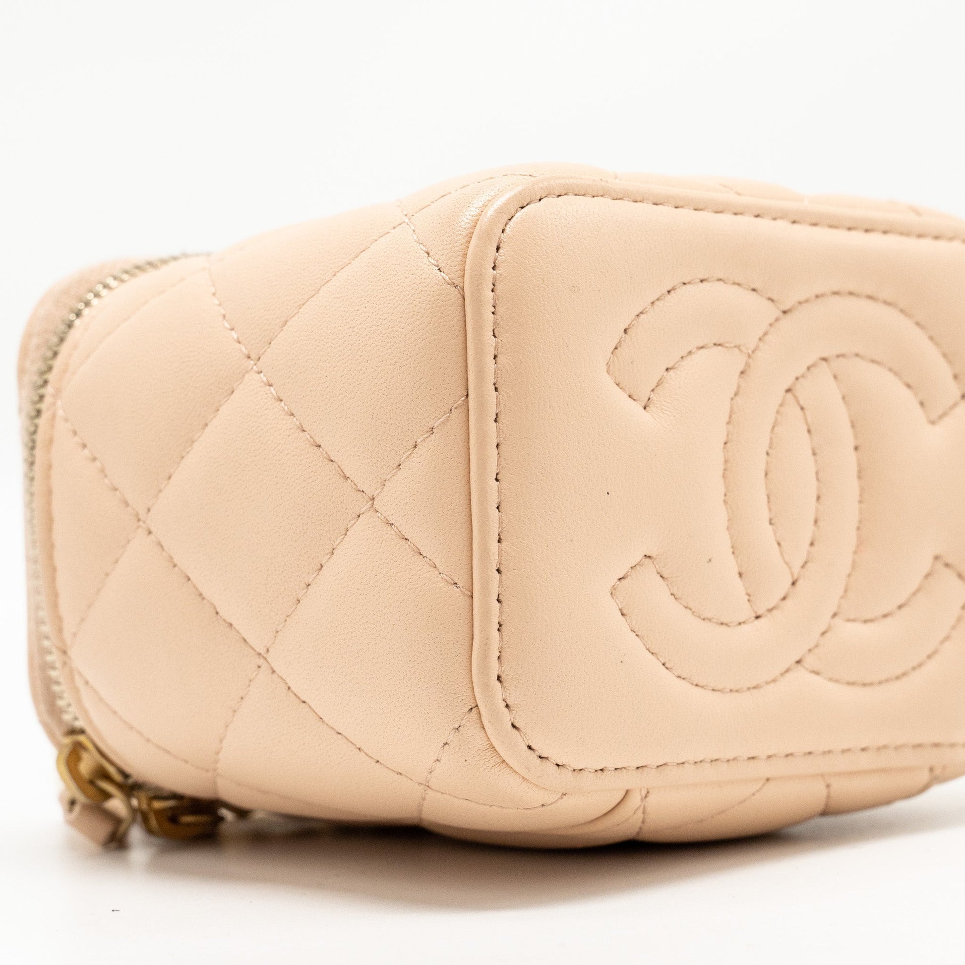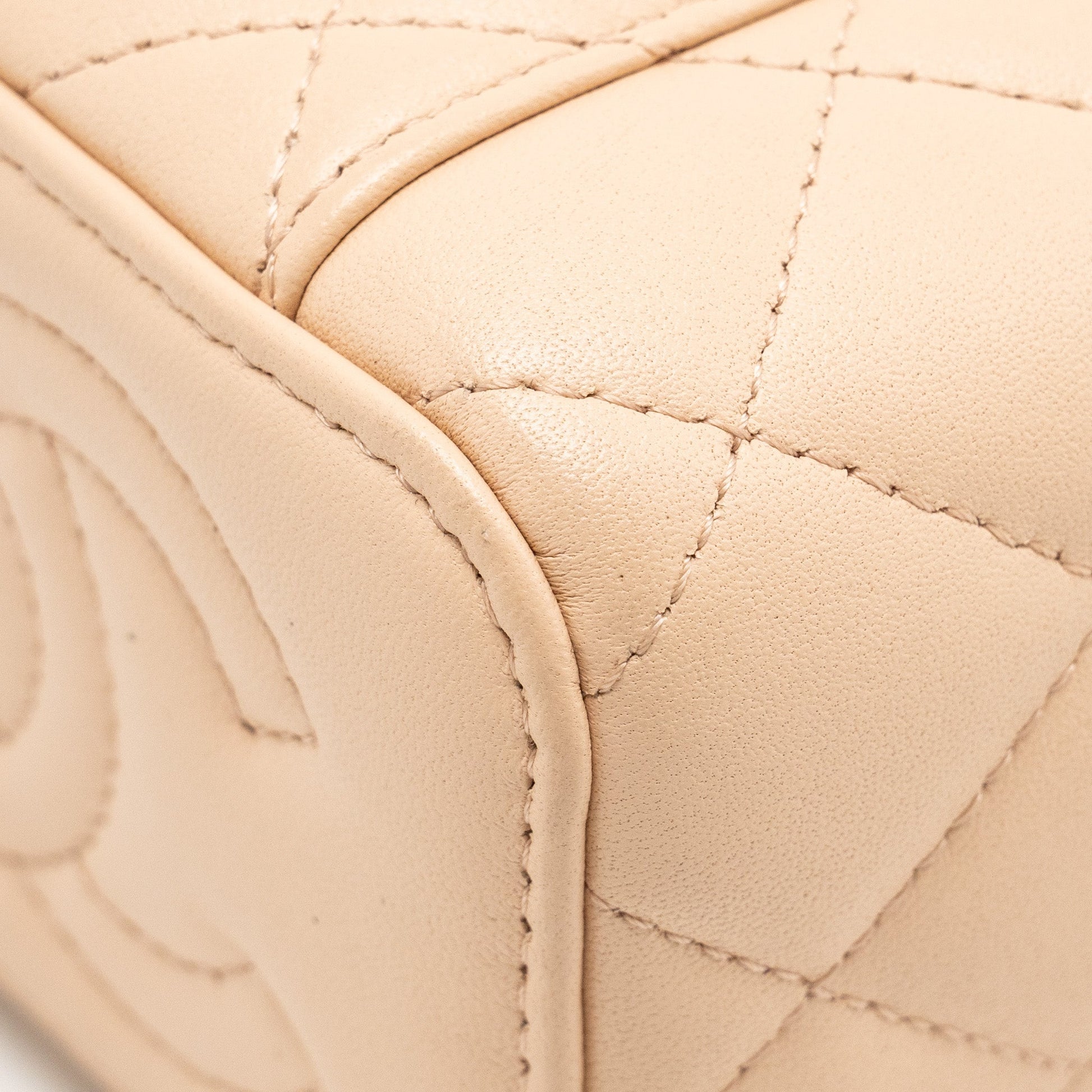 Chanel Mini Vanity Case With Camellia Adjustable Chain Lambskin Beige GHW (Microchip)