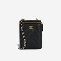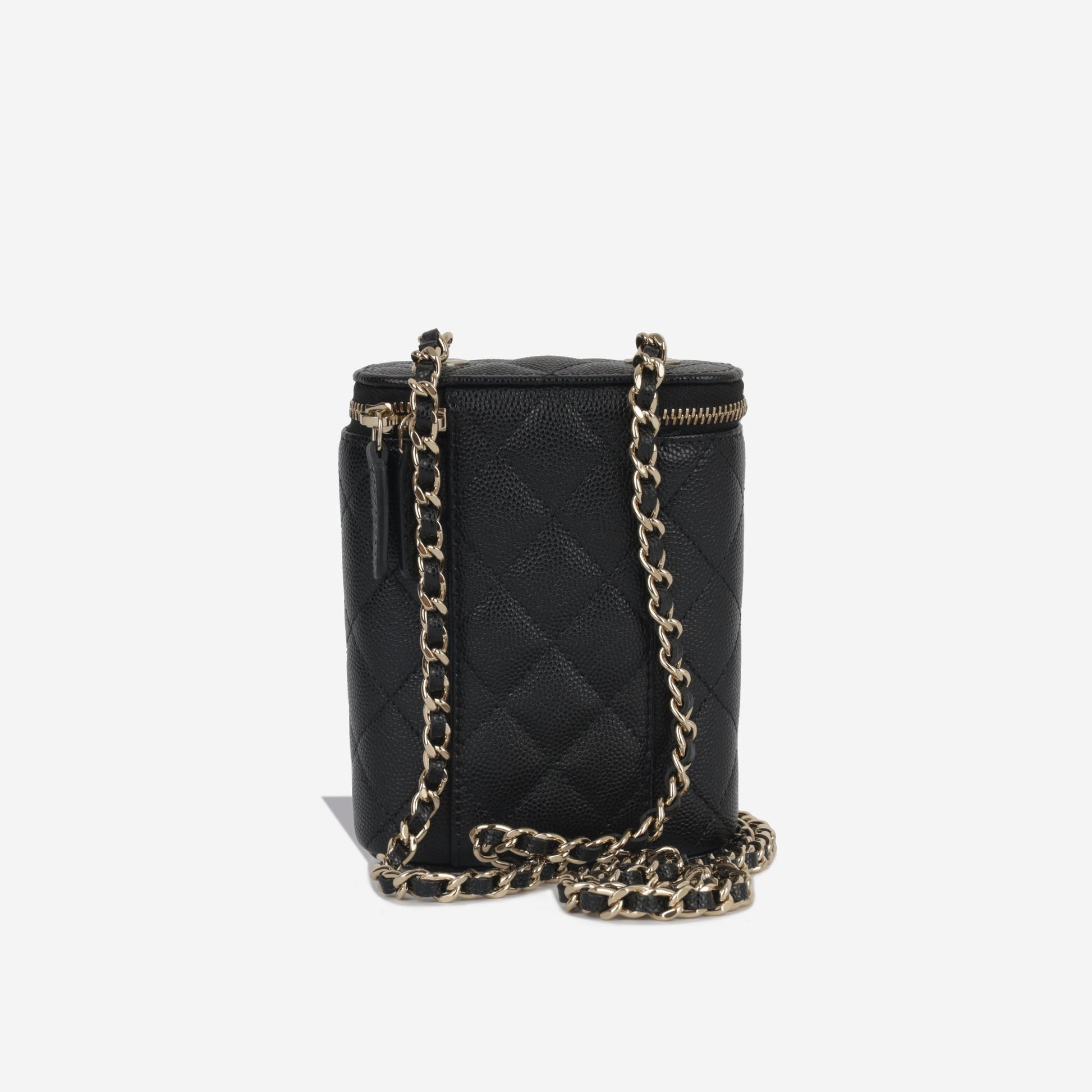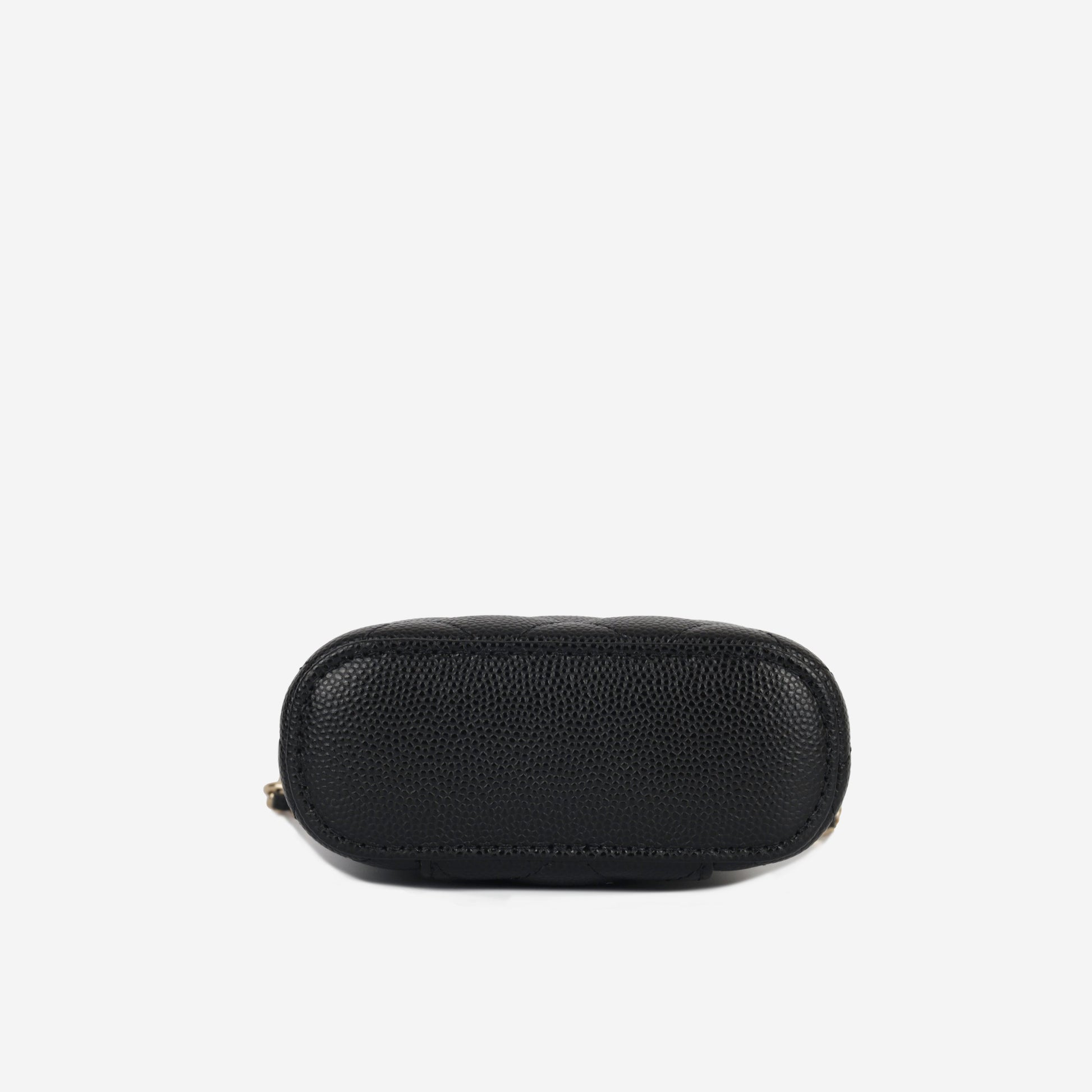 Primarily developed for storing your tiny beauty essentials and other small necessities, the vanity case has come a rather long way since its birth. With the “mini bag” remaining at the forefront of fashion accessory trends, this petite piece is the farthest thing from just a functional case. This beautiful modern vertical vanity case is crafted from black caviar leather and complimented with champagne gold toned hardware.
