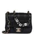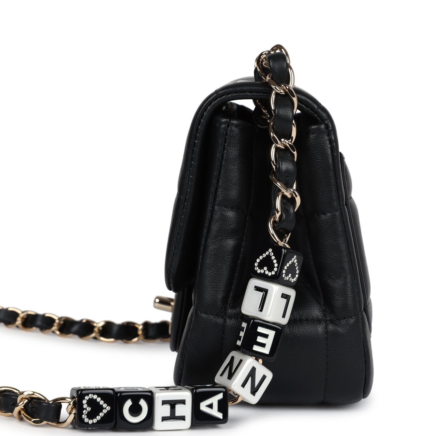 This limited edition Mini Square flap bag is in black lambskin with light gold tone hardware and has a front flap with signature CC turnlock closure, rear half moon pocket and single interwoven black leather and light gold tone chain link shoulder/crossbody strap with resin charms.