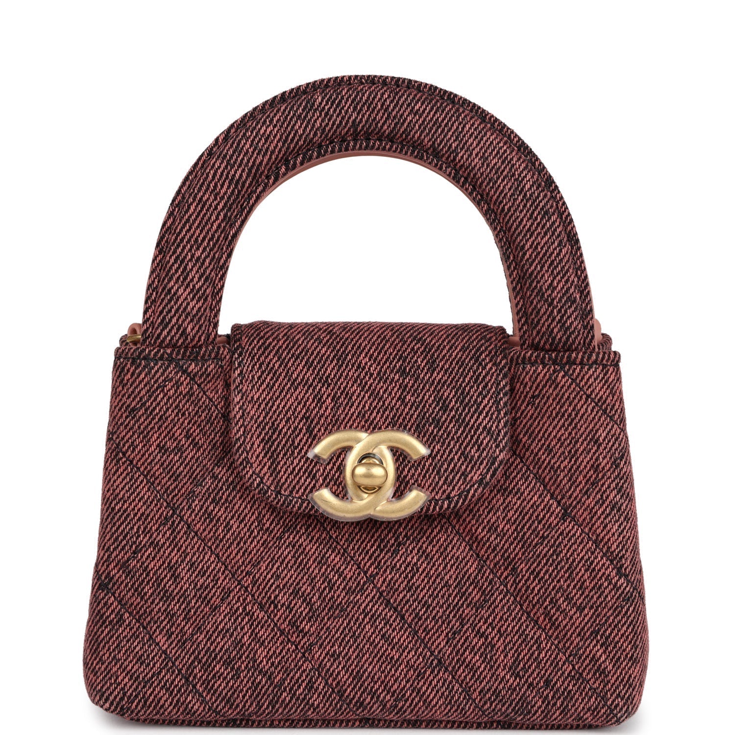This Nano Kelly Shopper is in pink and black washed denim fabric with brushed gold hardware, contrast stitching, two flat back top handles and a chain strap interwoven with leather, tab flap with CC turnlock acts as a closure.