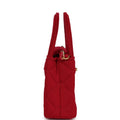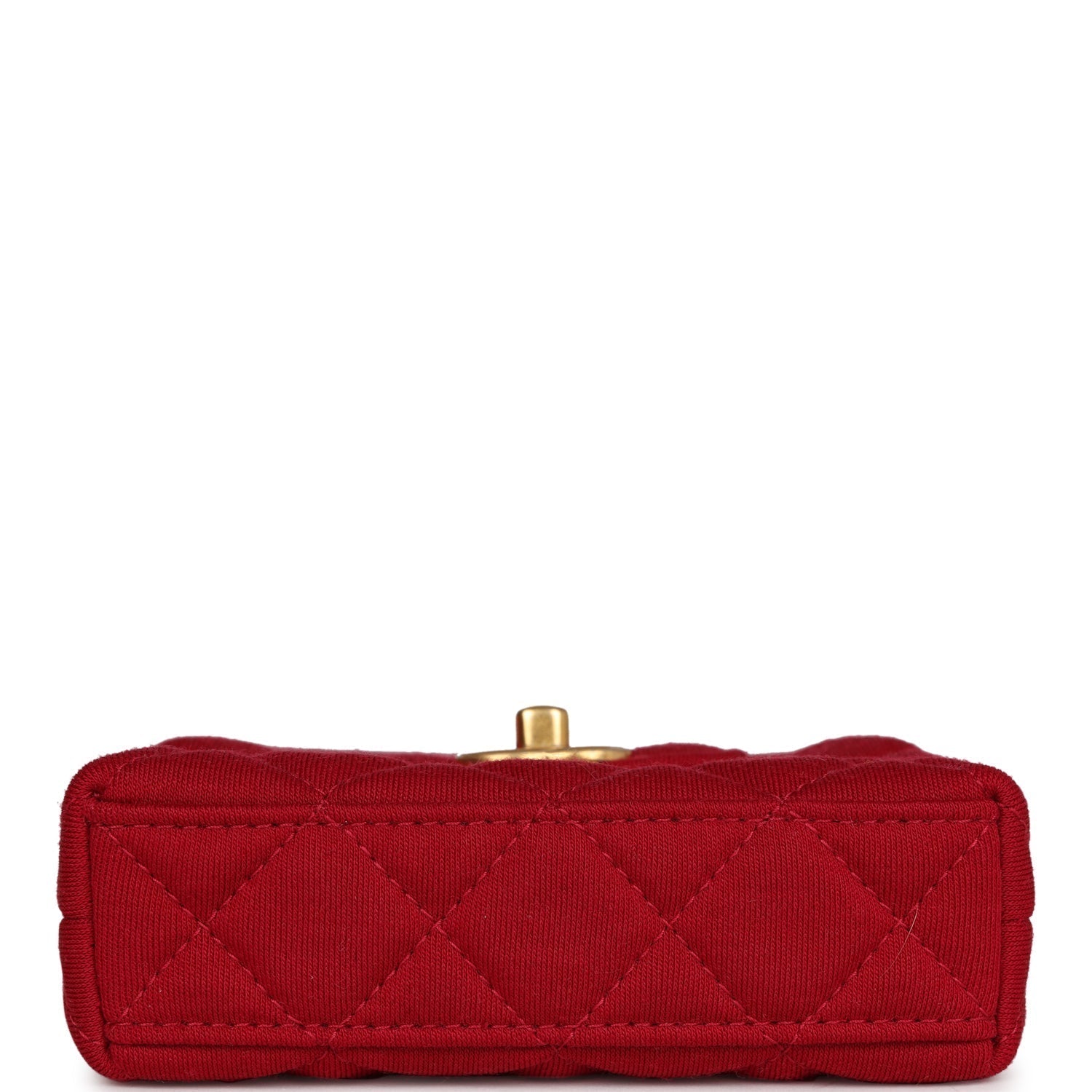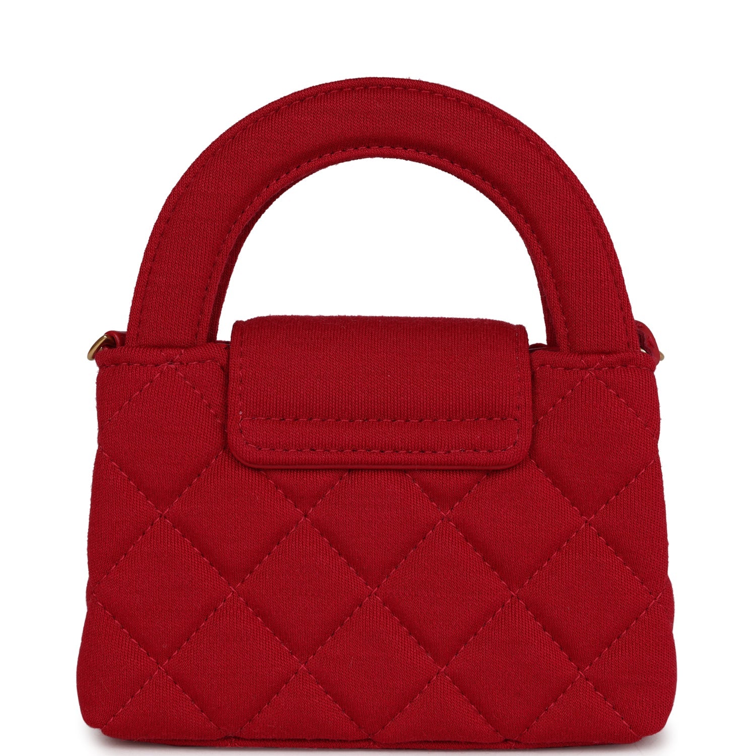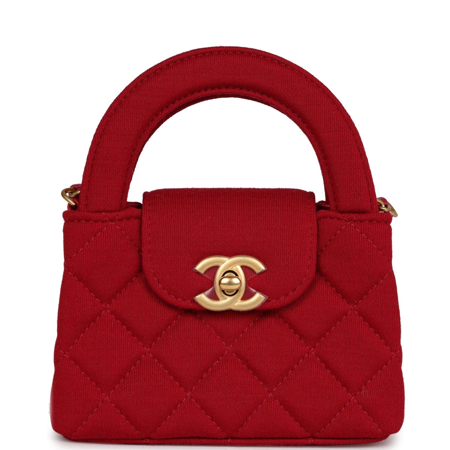 This Nano Kelly is in Red jersey with Brushed Gold Hardware, tonal stitching, two flat back top handles and an interwoven Aged Gold with Red jersey shoulder strap, and CC turnlock closure.