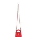 This Nano Kelly is in red shiny aged calfskin with brushed gold hardware, tonal stitching, two flat back top handles and an interwoven aged gold with red leather shoulder strap, and CC turnlock closure.