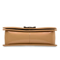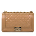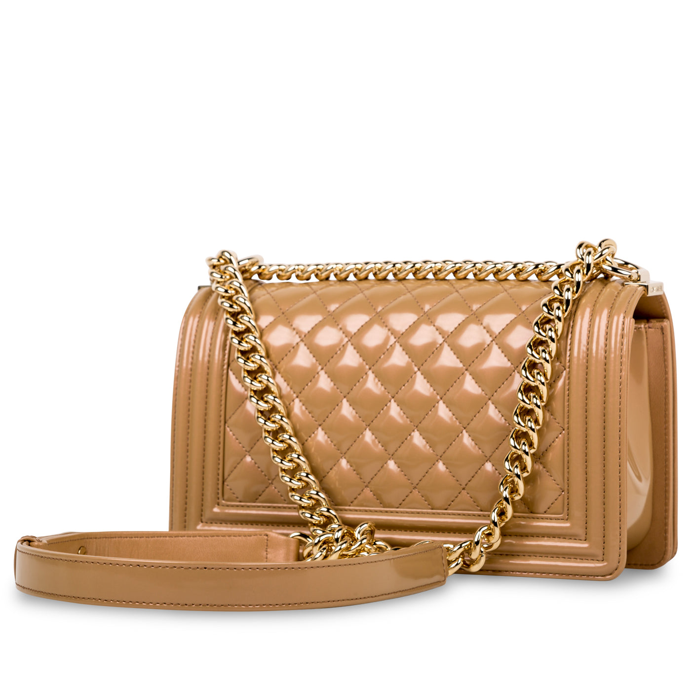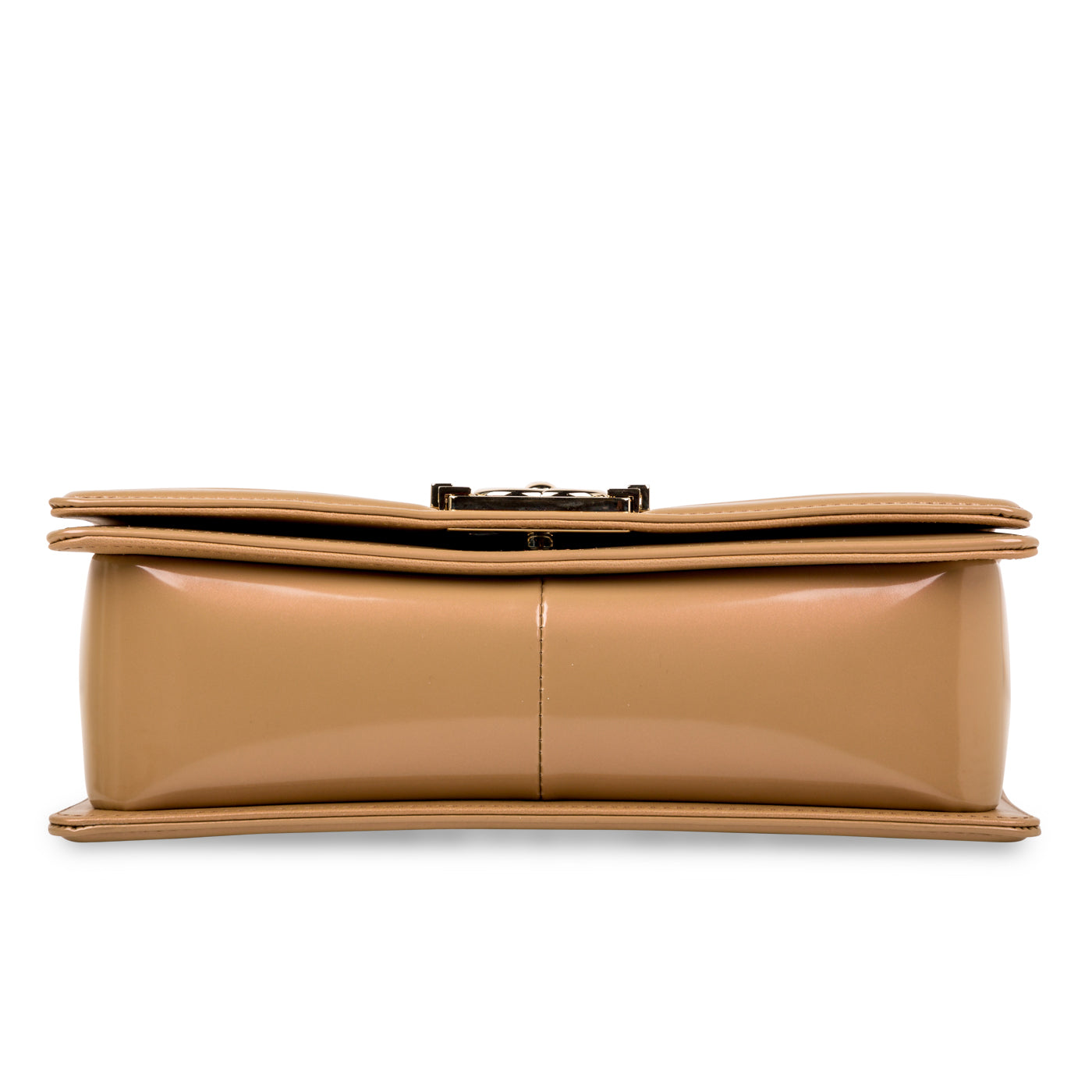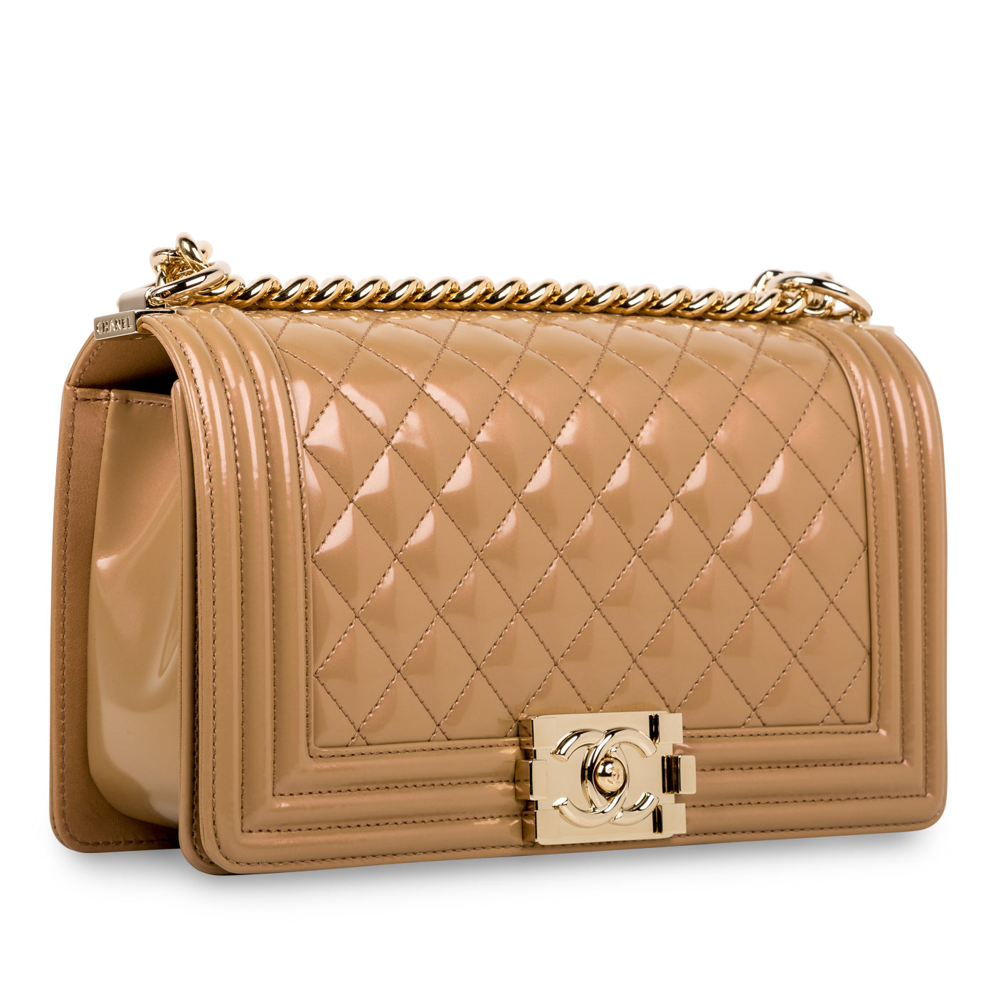 Chanel presents one of its highly-acclaimed and most sought after bags, the Chanel Boy Bag in Medium in the timeless combination of Dark Beige Patent Leather and Gold Hardware. As designed by Karl Lagerfeld, the Boy Bag collection was established to embody boyish charm and femininity. This magnificent handbag is crafted from quilted patent leather. Its charm is only fortified through the delicate punctuation of antique gold hardware from the chain-link strap to the signature CC push lock. Its interior features fabulous fabric lining and a single storage compartment, not to mention a subtle slip pocket.