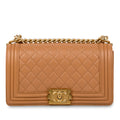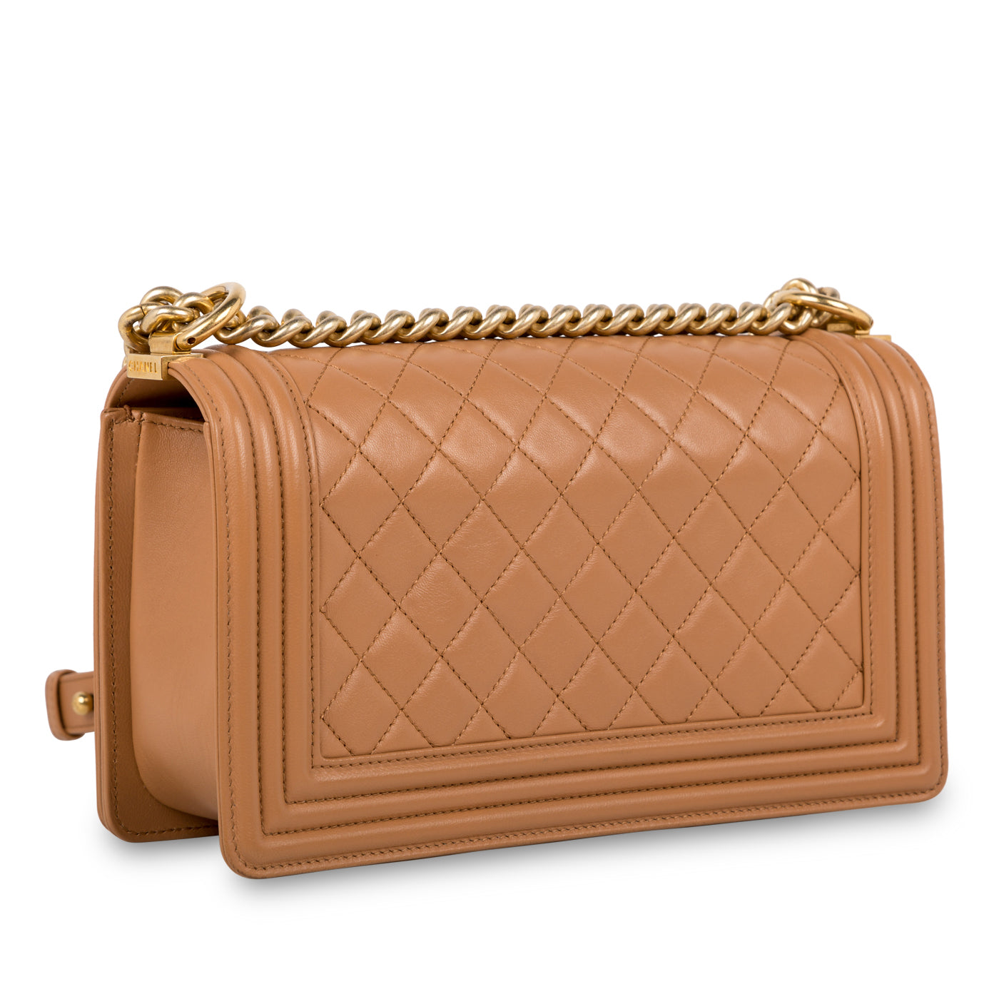 Chanel presents one of its highly-acclaimed and most sought after bags, the Chanel Boy Bag in size Old Medium in the wonderful and limited combination of Nude Lambskin Leather and Antique Gold Hardware. As designed by Karl Lagerfeld, the Boy Bag collection was established to embody boyish charm and femininity.