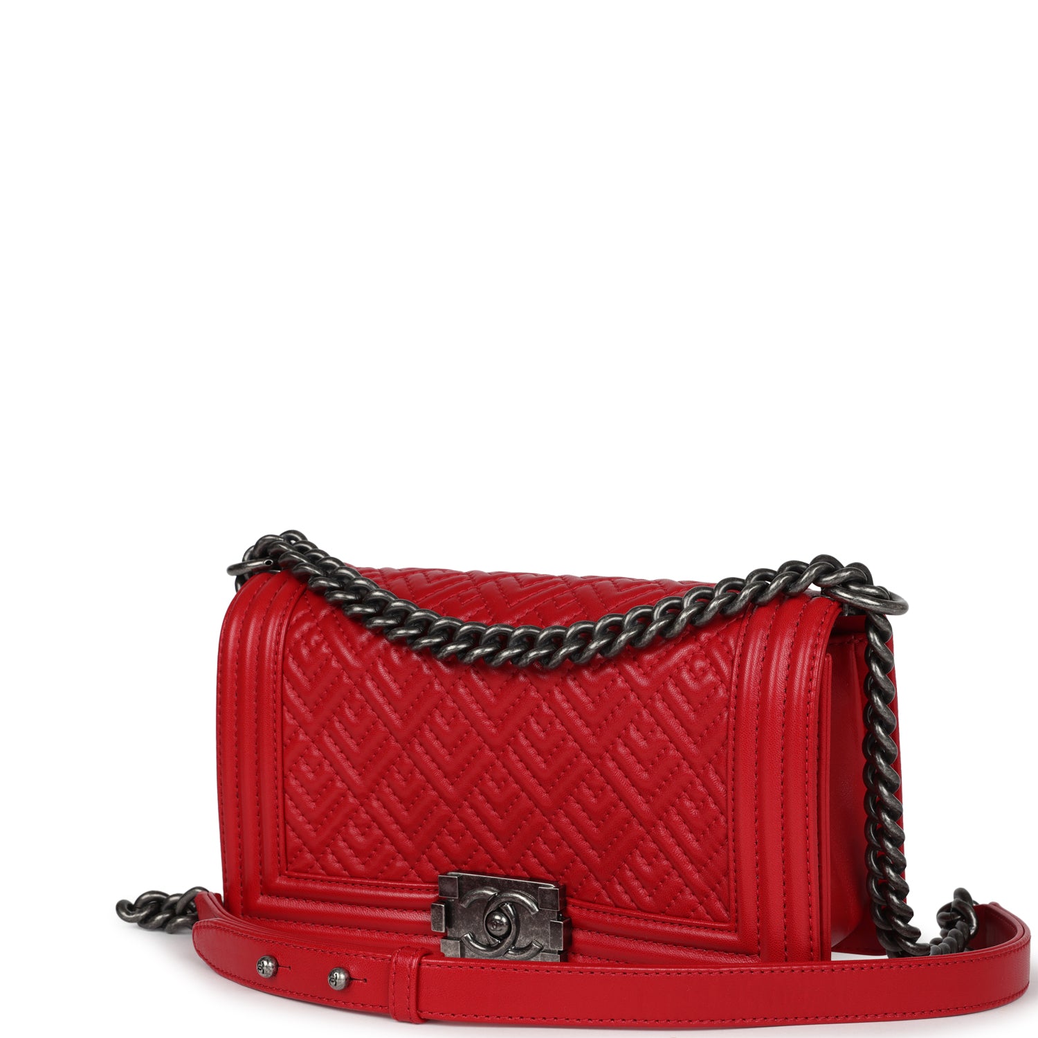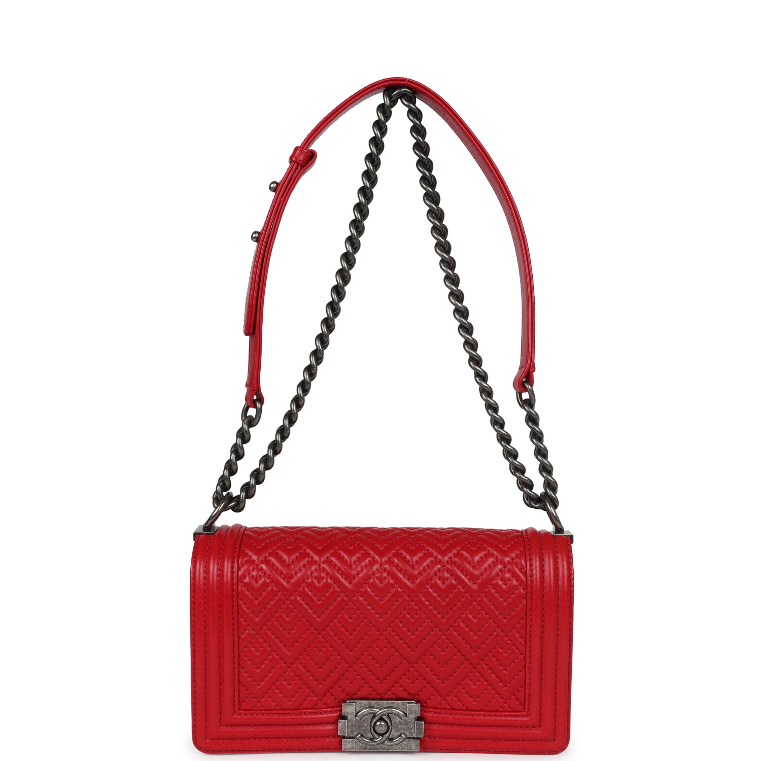 This Chanel Old Medium Boy Bag is in red lambskin leather with aged ruthenium hardware, featuring tonal stitching, geometric quilt printed leather, front flap with Le Boy CC push closure, smooth leather trim, and aged ruthenium chainlink and leather shoulder strap.