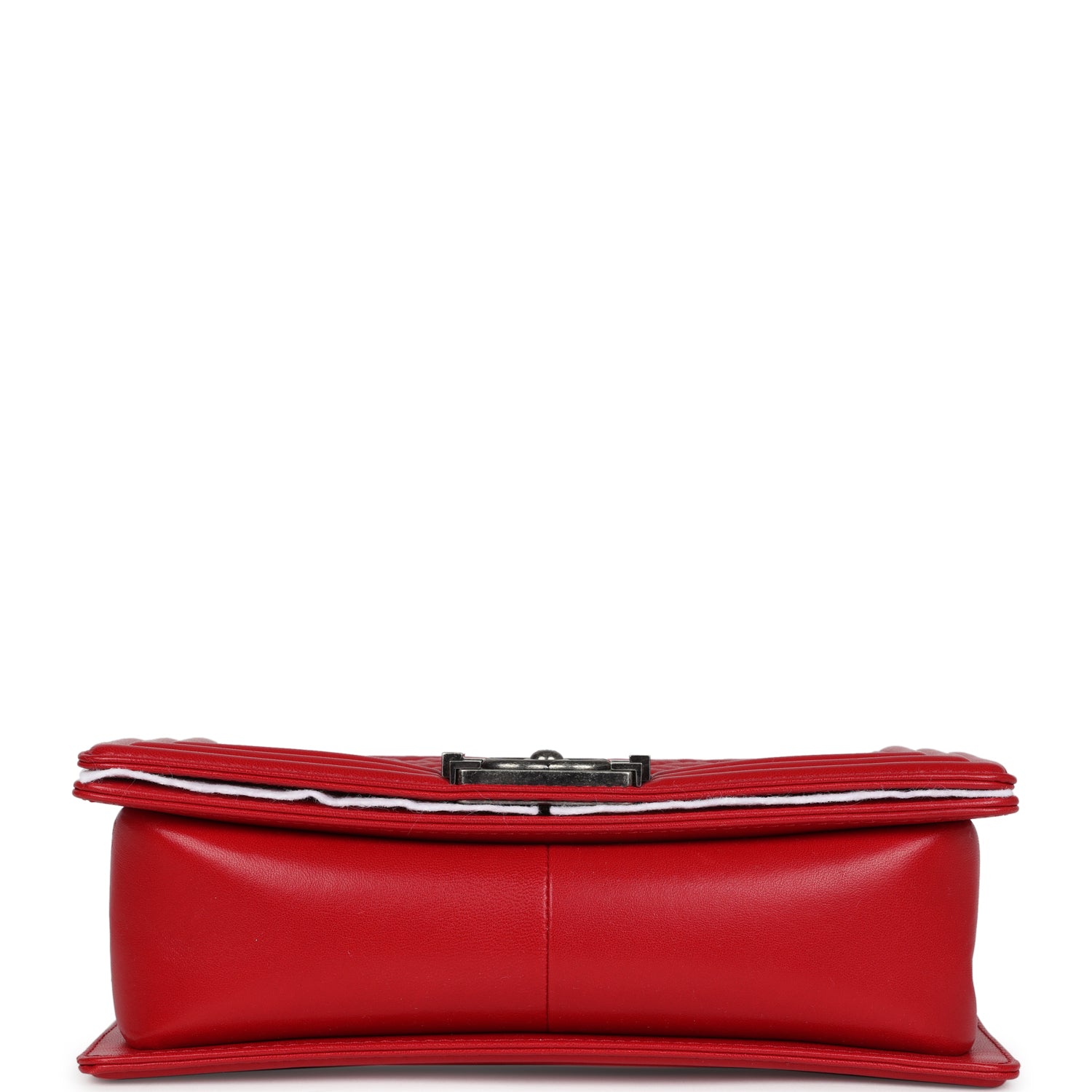 The interior is lined in red grossgrain fabric and has one slit pocket on rear wall.