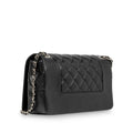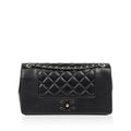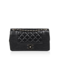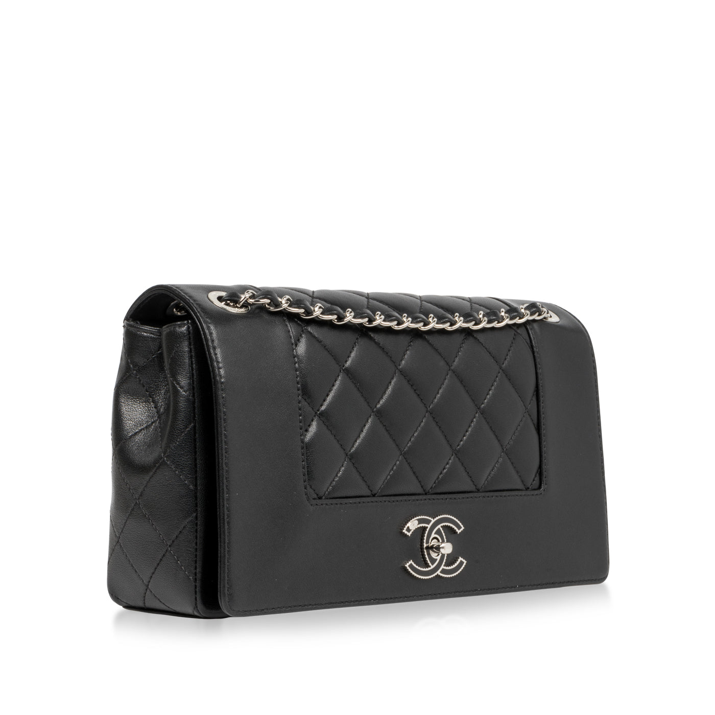 This flap bag from French fashion house Chanel is a rare find, having been shown at their runway collection for Paris in Rome. It features the signature quilted lambskin, contrasted against a smooth leather panel round the edges. In classic black it can be worn throughout the year, and the silver tone hardware is the iconic choice to make to stand out from the crowd.