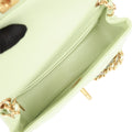 This Pearl Crush Mini Rectangular flap bag is of green lambskin with antique gold tone hardware and has a front flap with signature CC turnlock closure, rear half moon pocket, single interwoven green leather and antique gold tone chain link shoulder/crossbody strap with adjustable "pearl" ball.