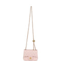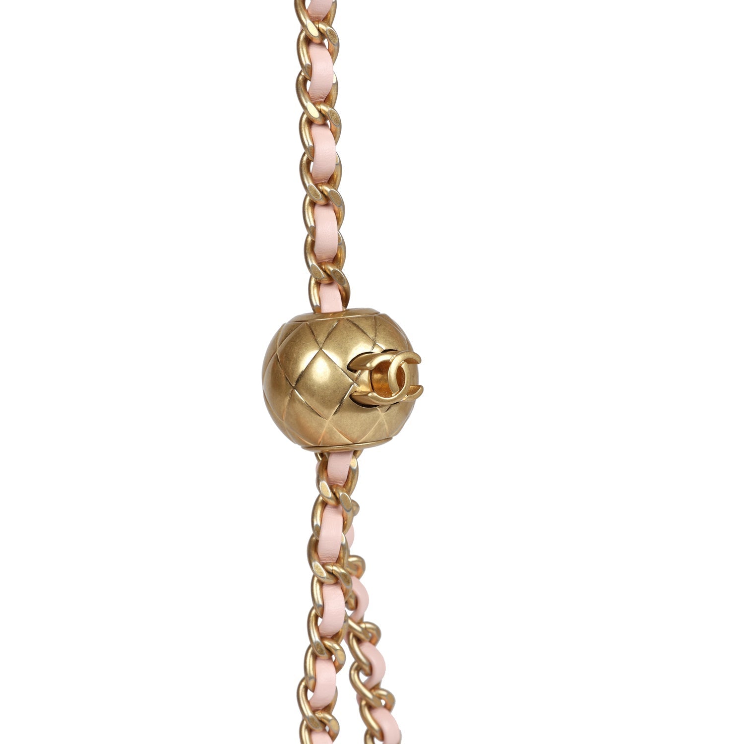 This Pearl Crush Mini Square flap bag is of light pink lambskin with antique gold tone hardware and has a front flap with signature CC turnlock closure, rear half moon pocket, single interwoven light pink leather and antique gold tone chain link shoulder/crossbody strap with adjustable "pearl" ball.