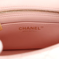 The interior is lined in light pink leather and features a zipper pocket with Chanel pull and an open pocket below.