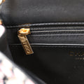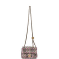 This Pearl Crush Mini Square flap bag is of multicolor tweed with antique gold tone hardware and has a front flap with signature CC turnlock closure, rear half moon pocket, single interwoven black leather and antique gold tone chain link shoulder/crossbody strap with adjustable "pearl" ball.