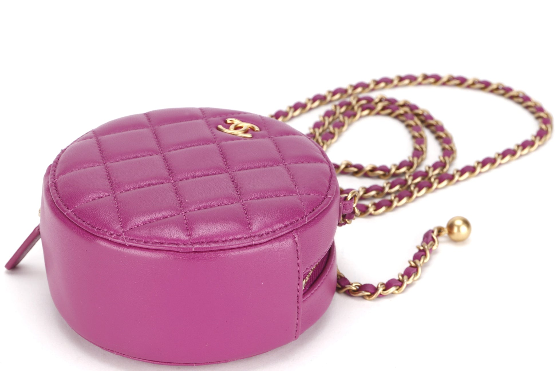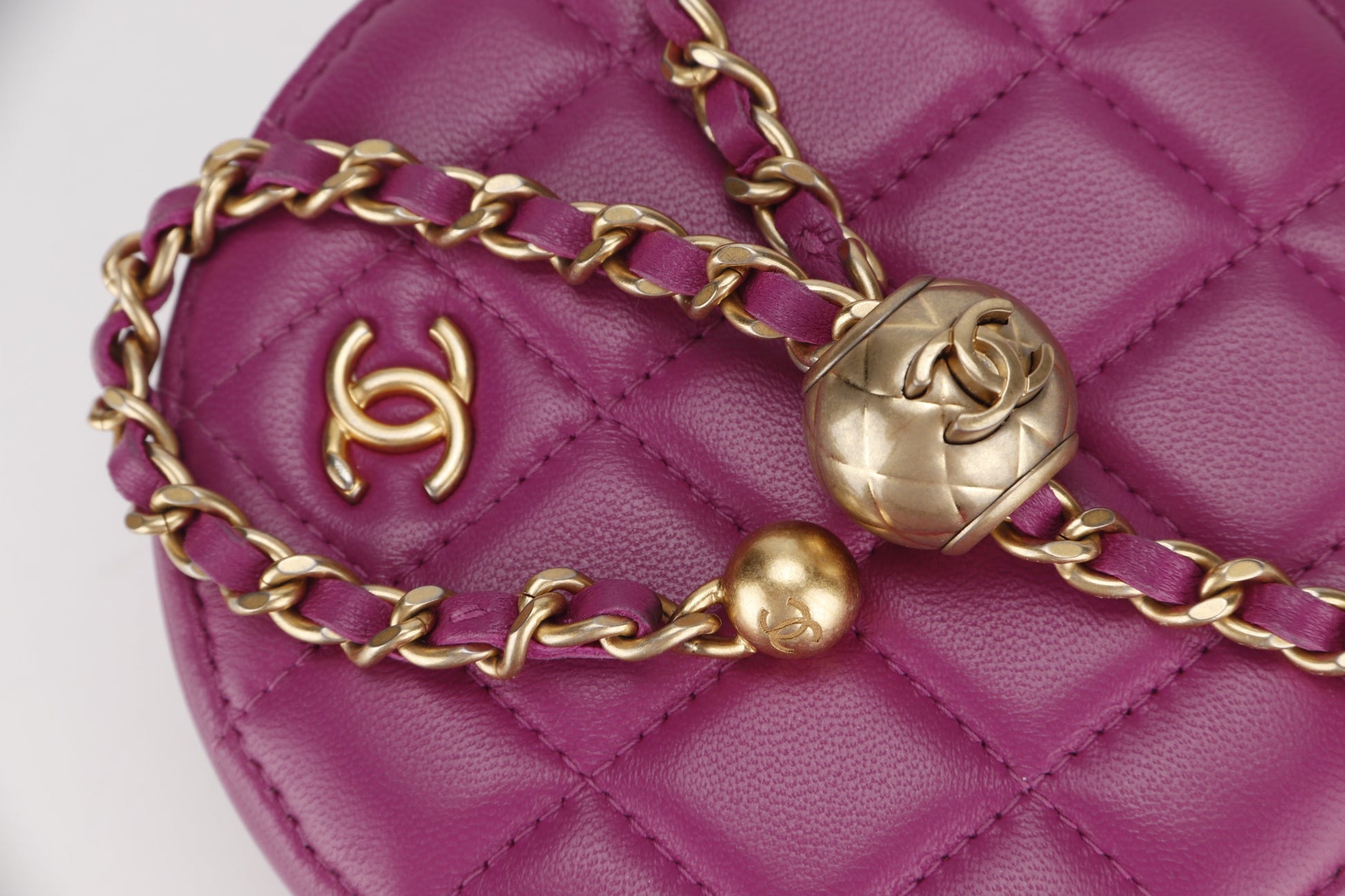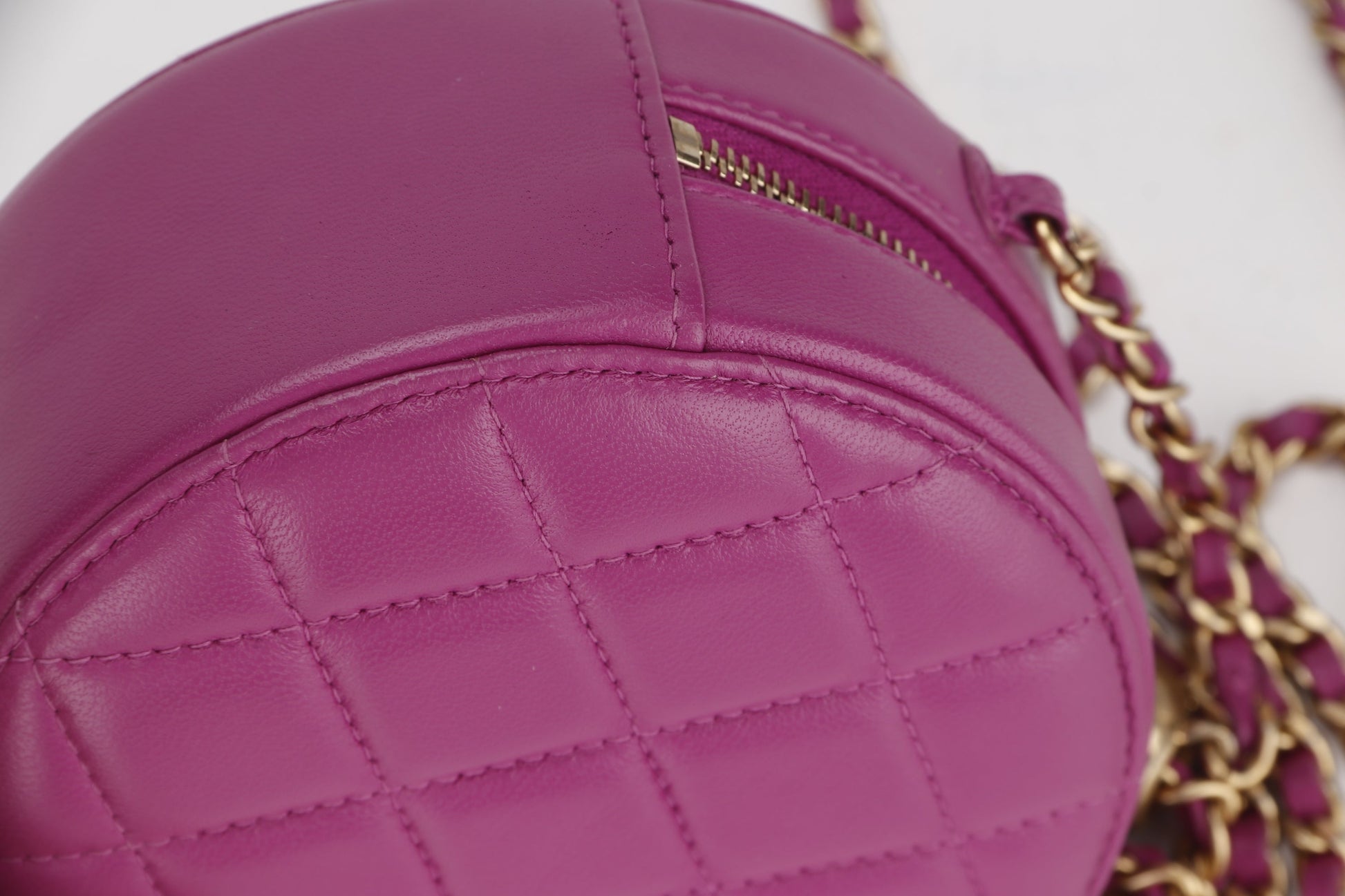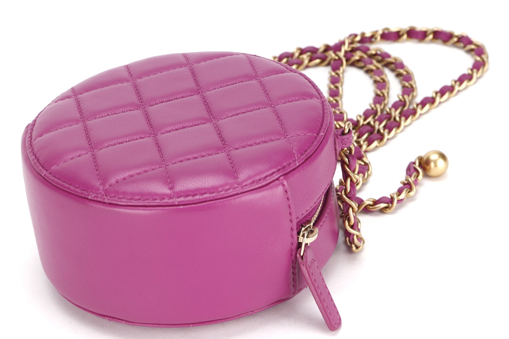 CHANEL PEARL CRUSH ROUND CLUTCH WITH CHAIN (3086xxxx) PURPLE LAMBSKIN GOLD HARDWARE, WITH , DUST COVER & BOX