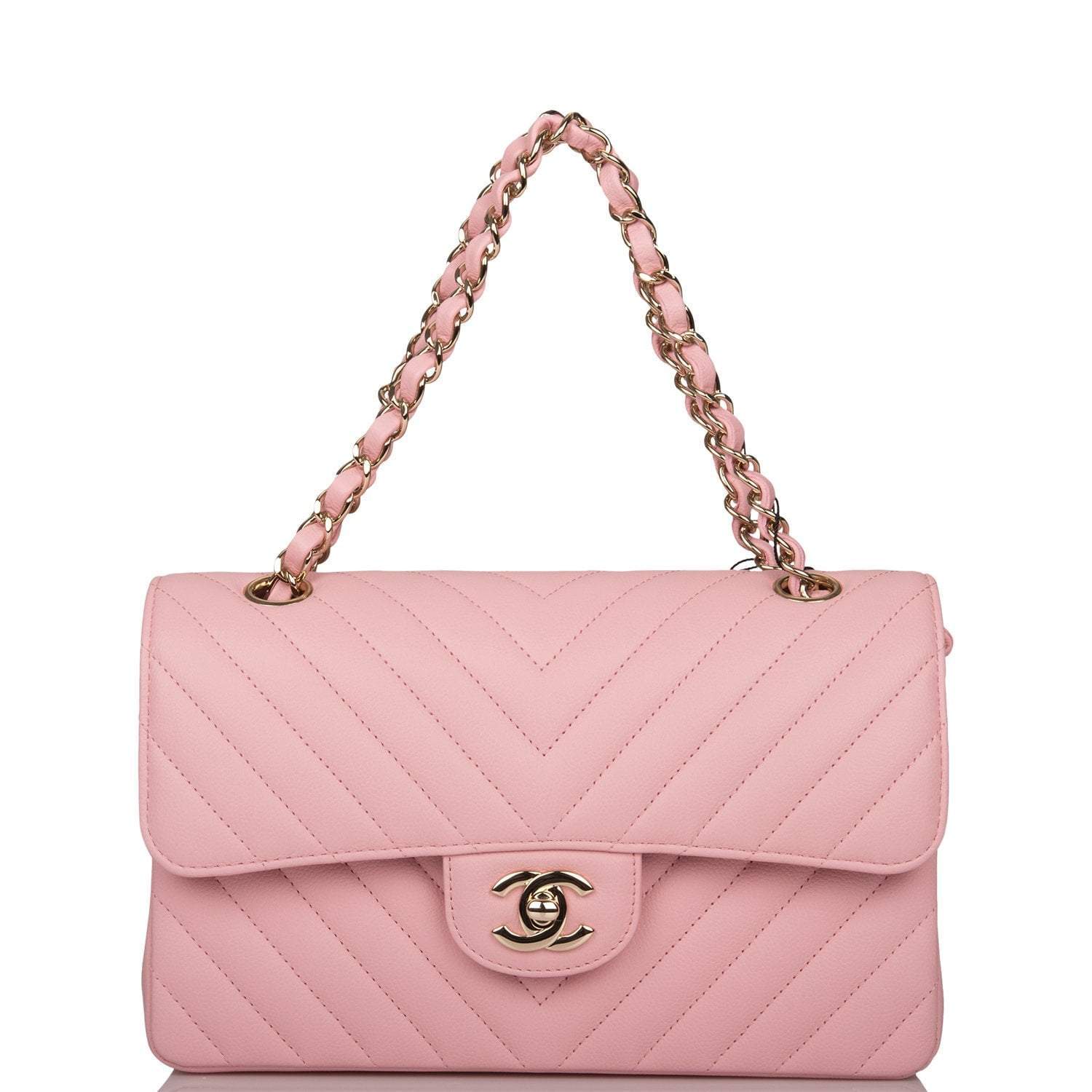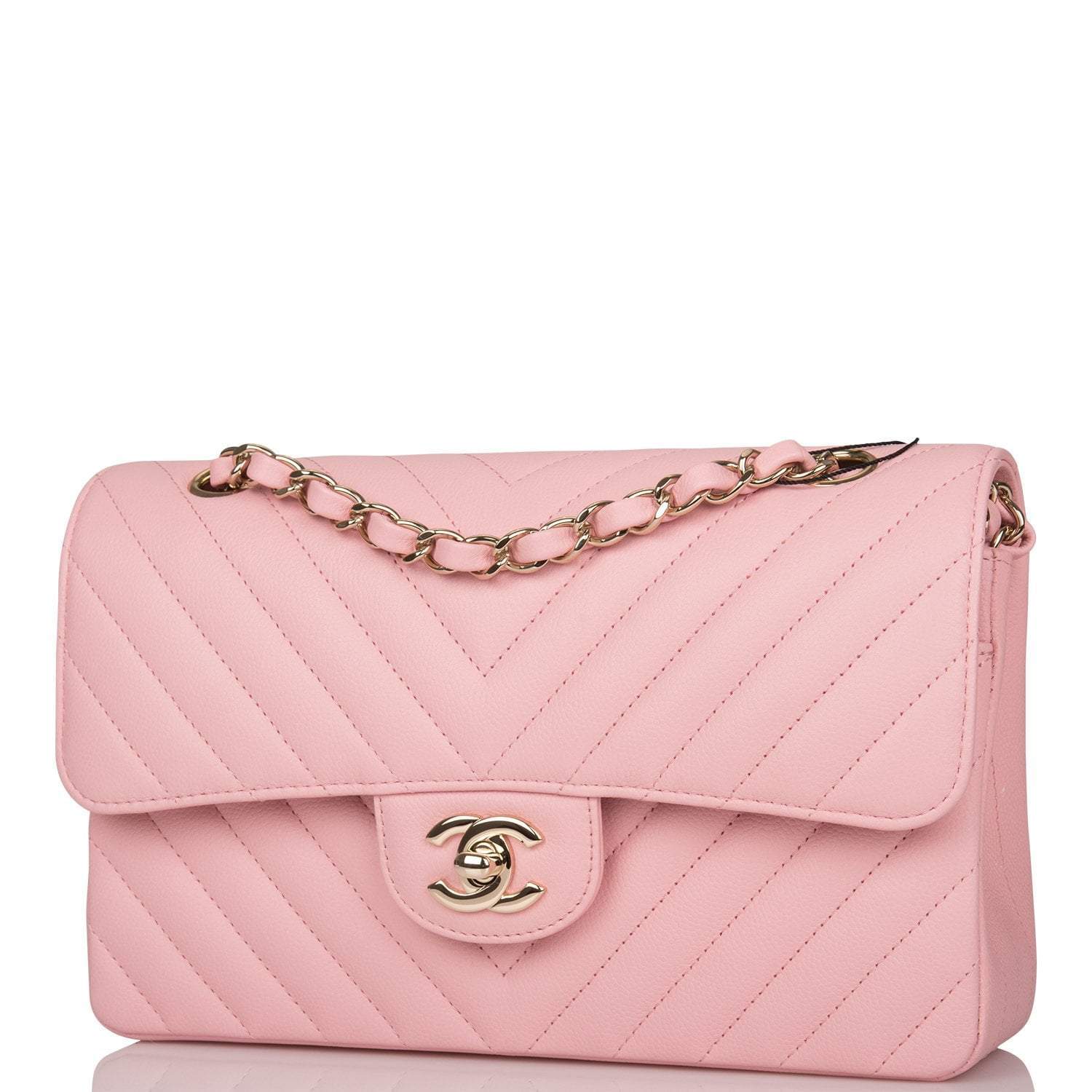 This Small Classic Flap Bag is in pink caviar leather with light gold hardware and features a front flap with CC turnlock closure, halfmoon back pocket and adjustable interwoven light gold tone chain link and pink leather shoulder/crossbody strap.