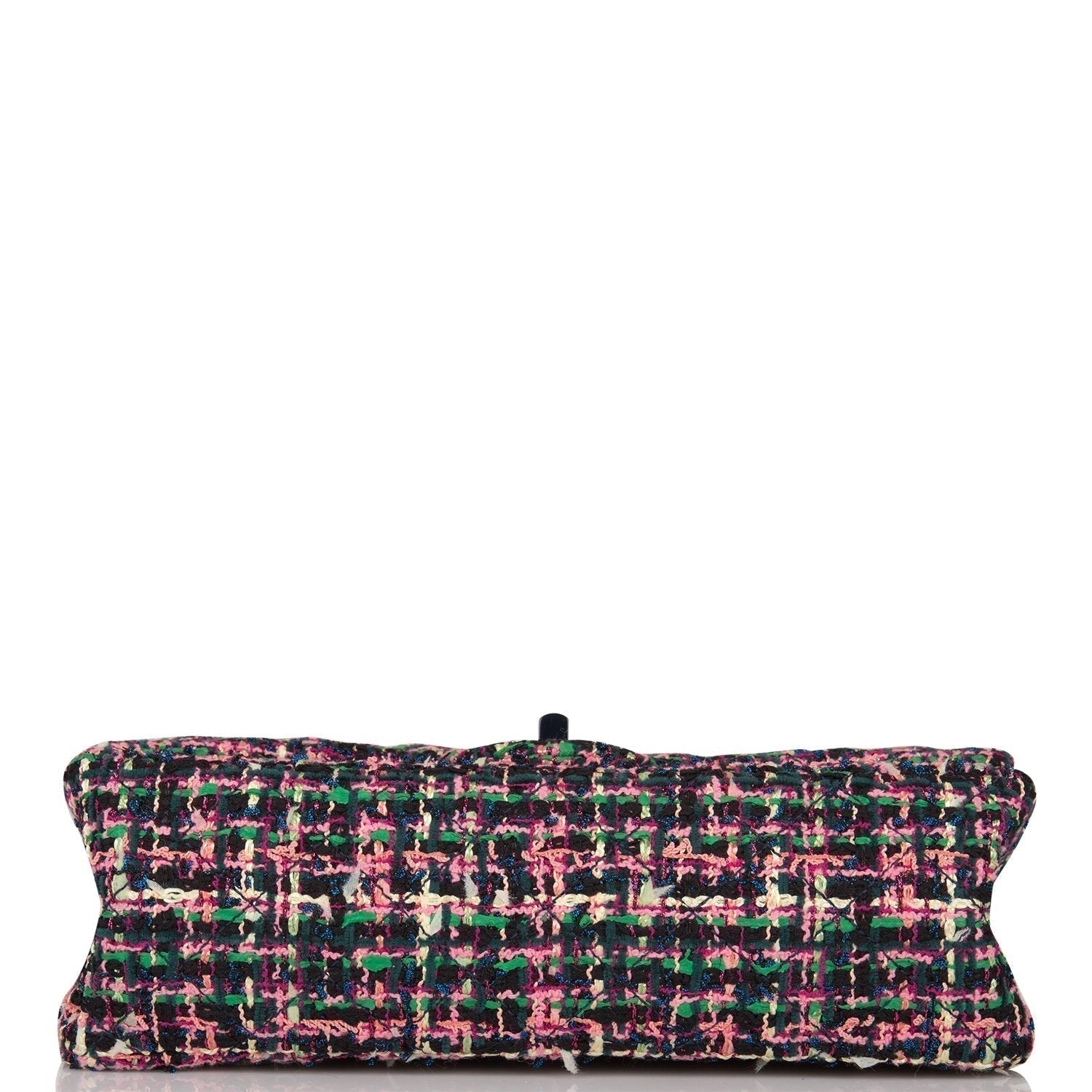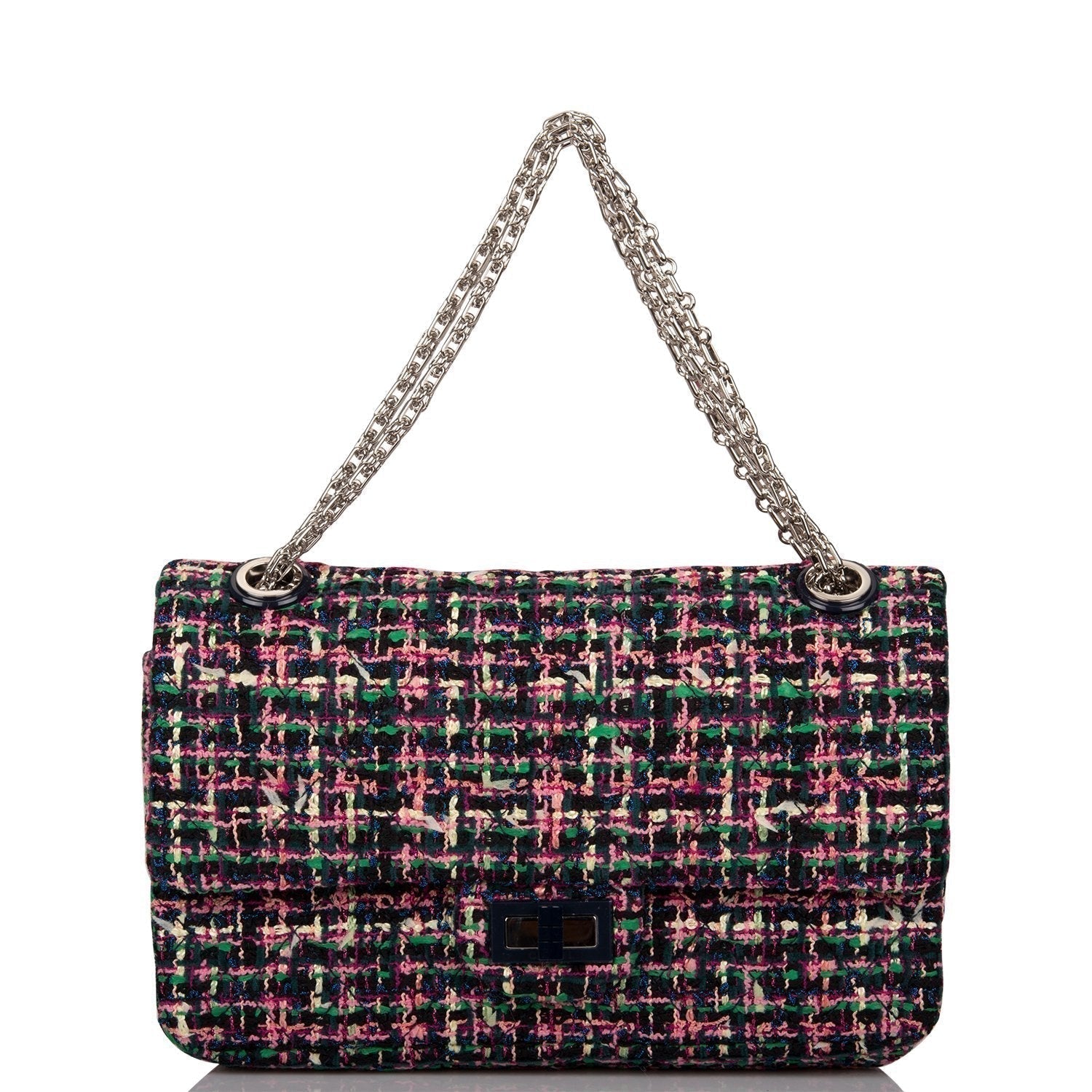 This Chanel 2.55 Reissue Flap 225 comes to you in a fun Multi-coloured tweed! Paired with shiny silver-tone hardware, the flap features a Reissue turnlock in navy and silver and has a zippered pocket on its underside and a slide pocket beneath it. The second flap is logo stitched on its underside and snaps over a slide pocket on the face. In navy leather, the interior has two slide pockets, while the back face has an additional slide pocket—that makes six hidey holes in all. The all-chain strap has a shoulder drop of 11 inches when doubled and a crossbody drop when worn singly with a 20-inch drop. In excellent condition from 2017-18, it comes with a dustbag, box, and card, and has a little wear inside. In a blend of black, green, pink, cream, and a sparkly blue, this tweed pops!