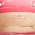 - Features a CC logo on the front, a top handle, and an interwoven silver tone chain link with pink leather shoulder strap.