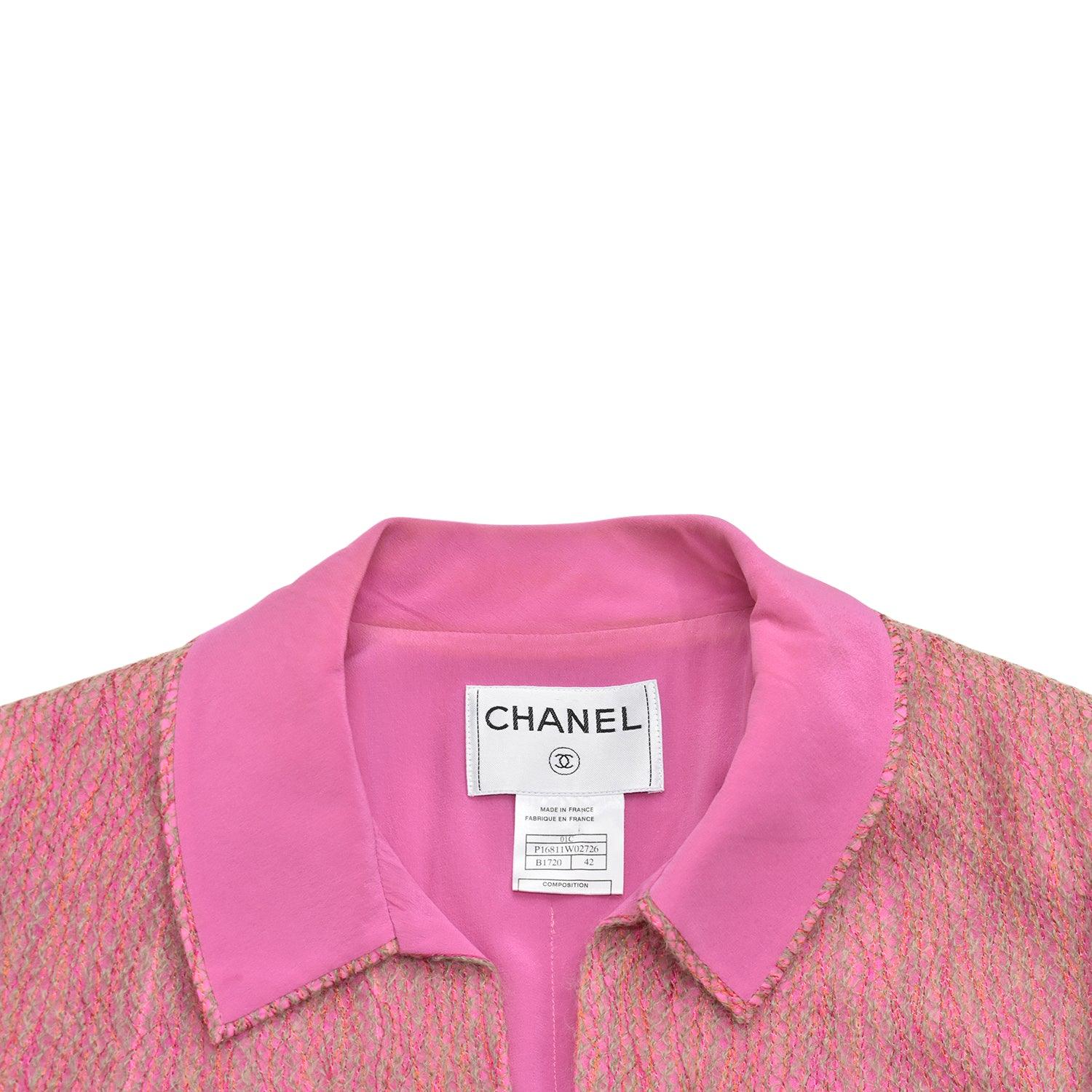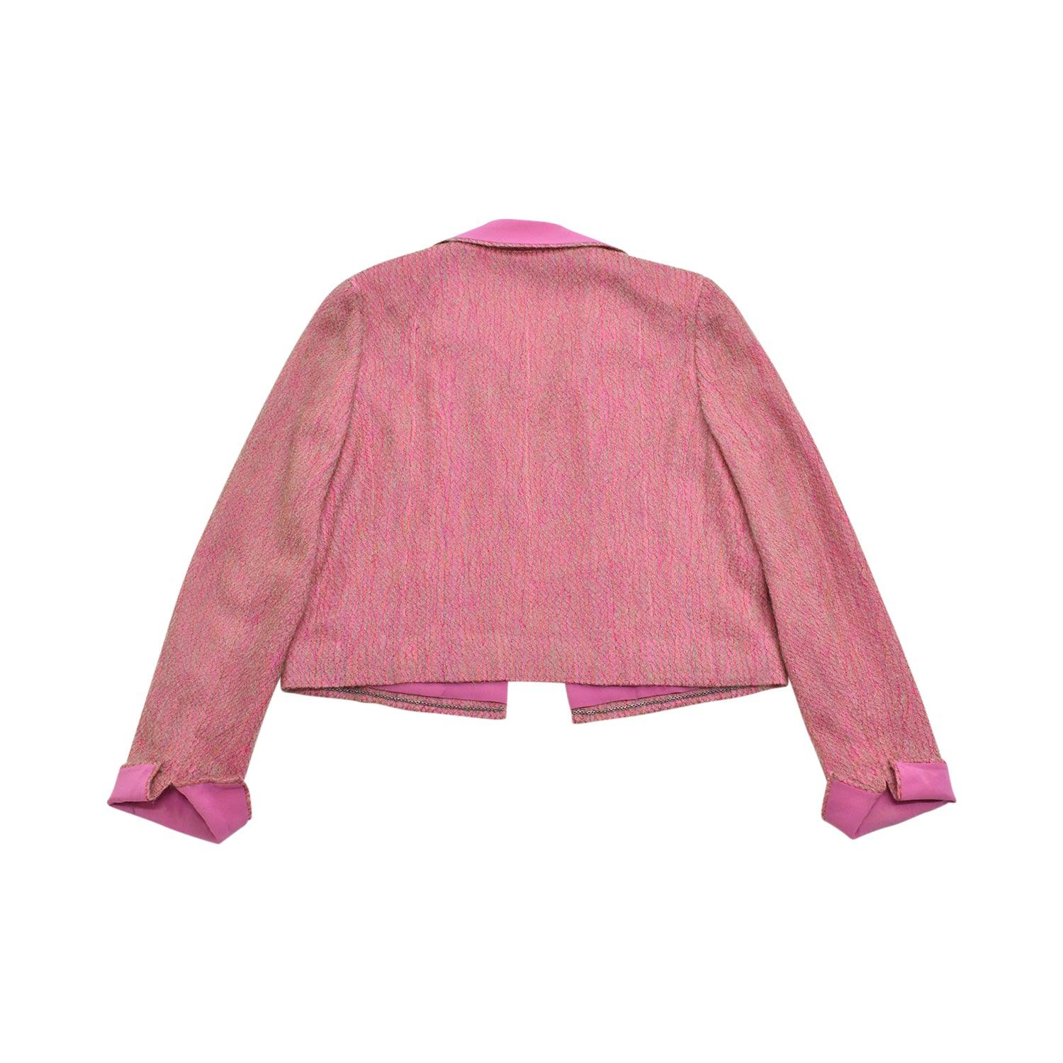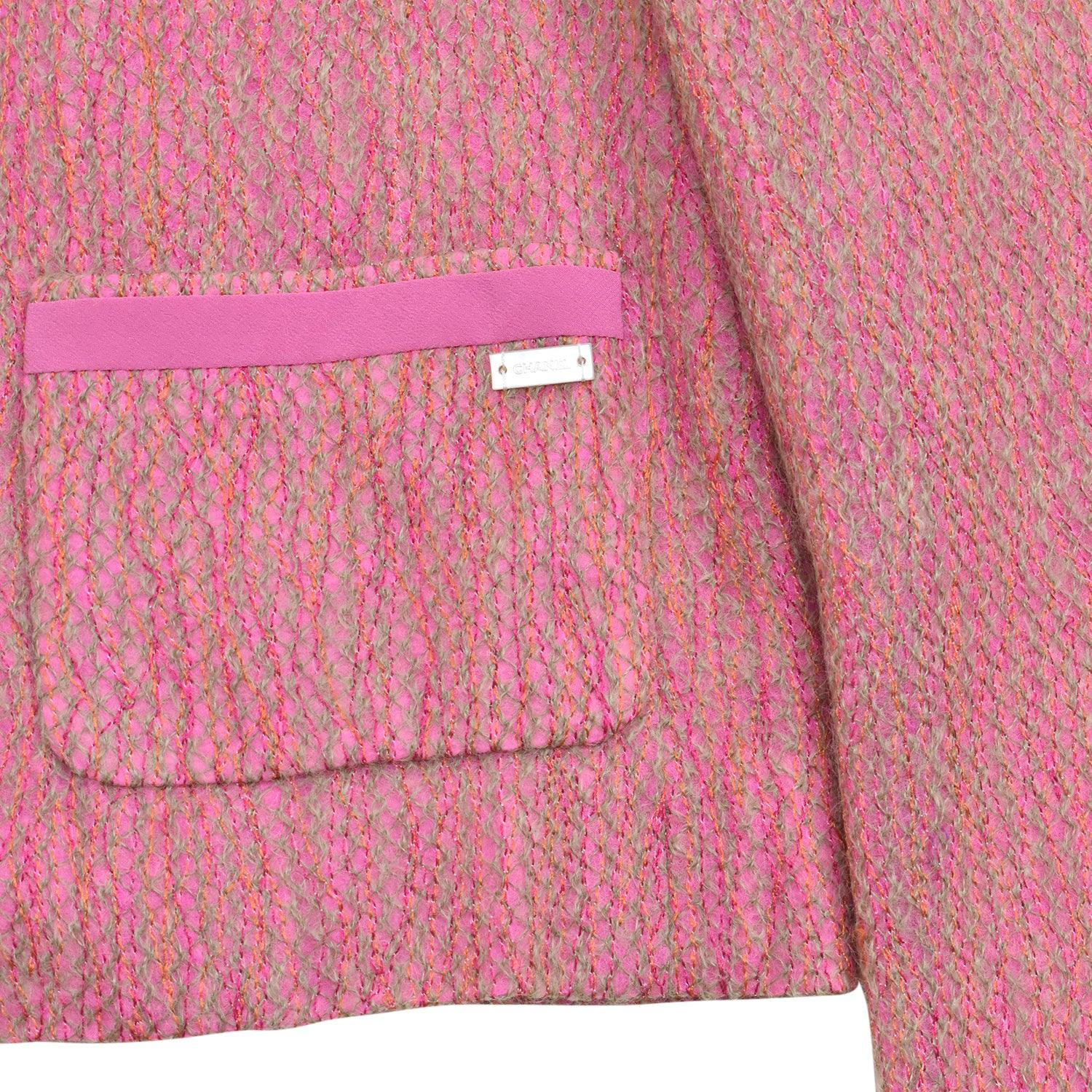 Chanel open blazer in pink and orange mohair and tweed blend with sage green woven threads and pink silk lining. Features open pockets with pink ribbed trim and