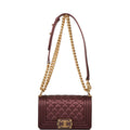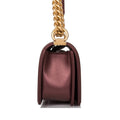 This Small Boy bag is in plum metallic quilted calfskin leather with antique gold tone hardware and features a full front flap with the Le Boy CC push lock closure and an antique gold tone chain link and plum leather padded shoulder/crossbody strap.