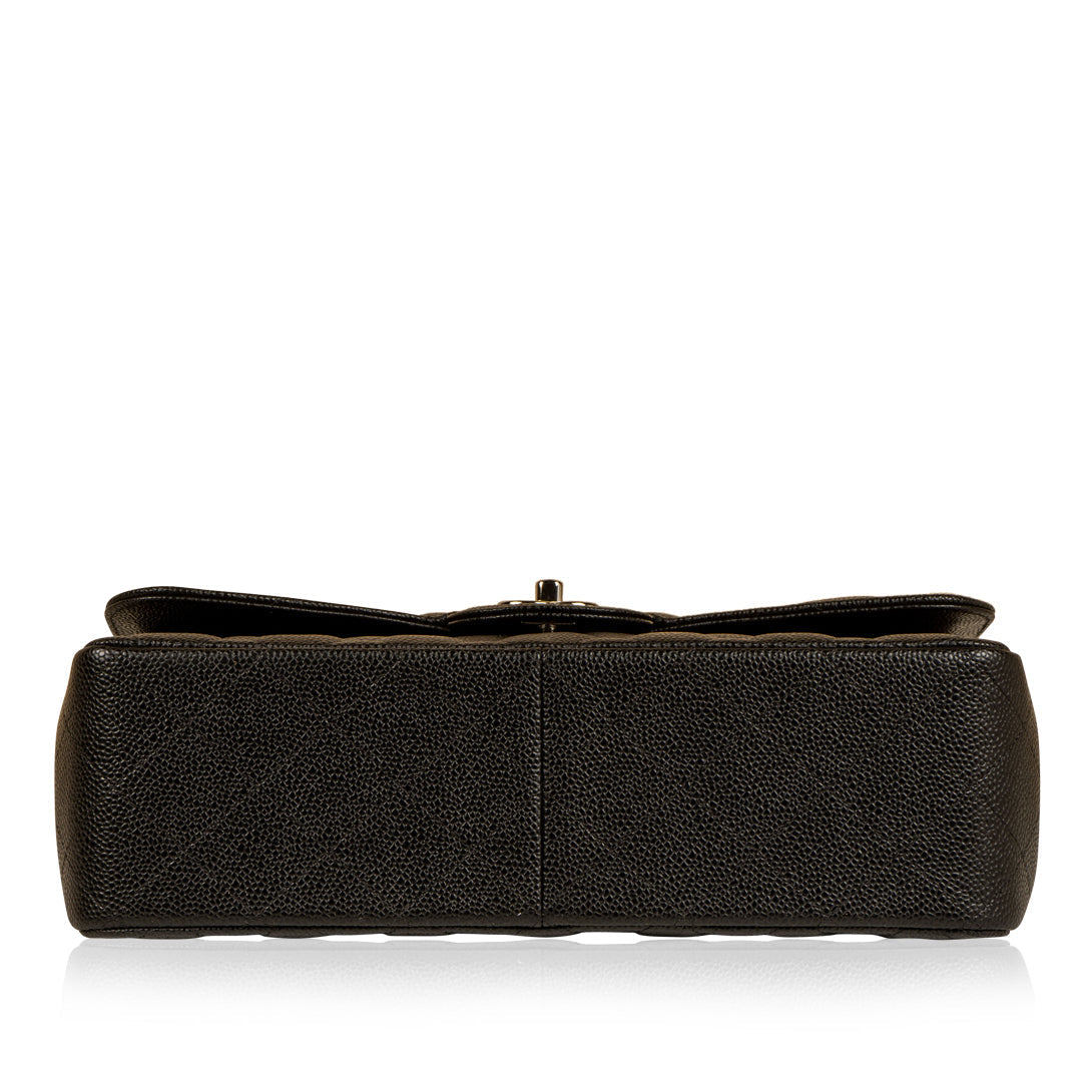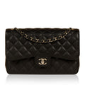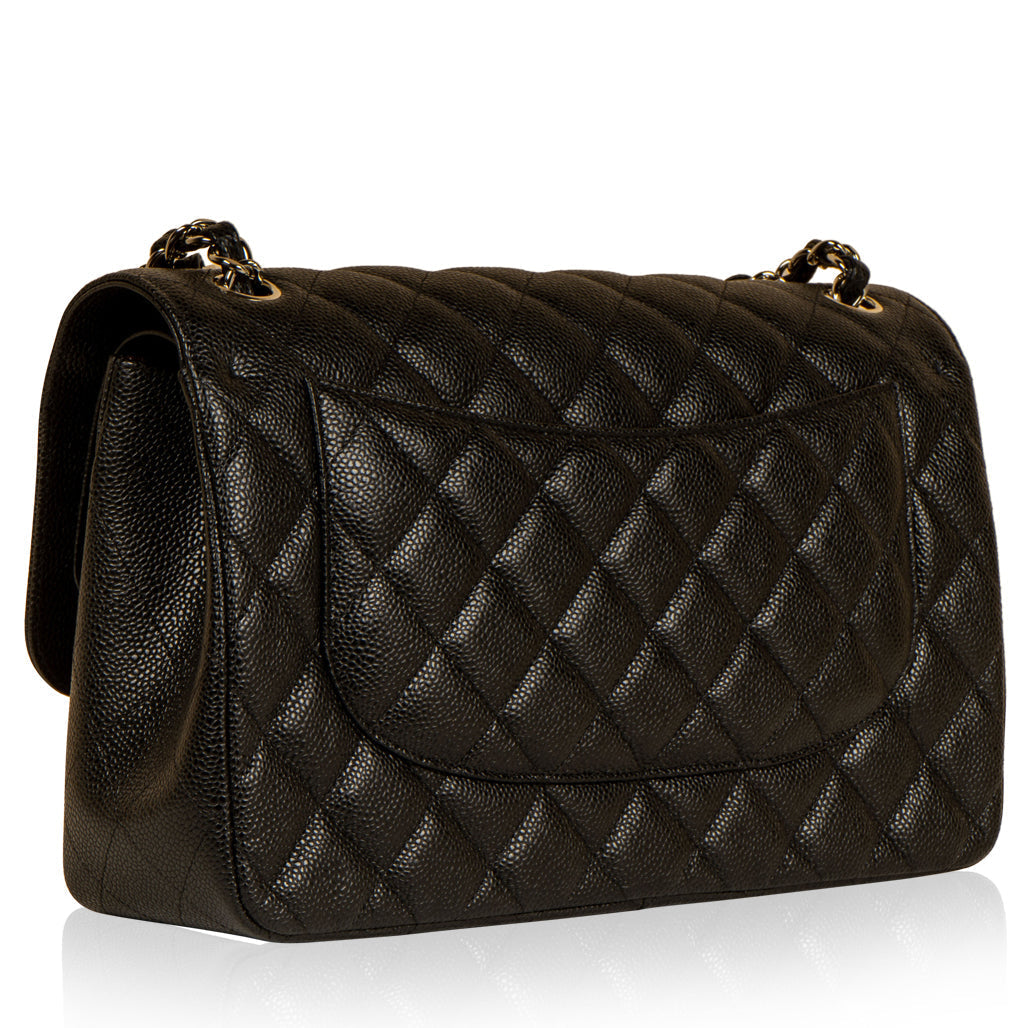Chanel continues to present its signature line of Classic Flap bags. Under the creative direction of Karl Lagerfeld, the Classic Flap is perhaps the most acclaimed bag in all of fashion history. Timeless, elegant and sophisticated, it's no wonder the Classic Flap is, well, a classic. Featuring its infamous quilted caviar leather and interwoven chain / leather strap, the Jumbo is an absolute must-have in any luxury handbag collection. Not only is this highly coveted, stunning black bag the perfect compliment to pretty much anything you have in your wardrobe, but it's also an investment piece that will never lose its value. Embodying elegance and traditional femininity to a T, a Chanel bag is a purchase you won't ever regret.