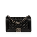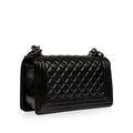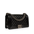 Chanel presents one of its highly-acclaimed and most sought after bags, the Chanel Boy Bag in Medium in the timeless black leather hue. As designed by Karl Lagerfeld, the Boy Bag collection was established to embody boyish charm and femininity. This magnificent handbag is crafted from smooth lambskin and is meticulously adorned with ruthenium-finish metal. Its interior features fabulous fabric lining and a single storage compartment, not to mention a subtle slip pocket.
