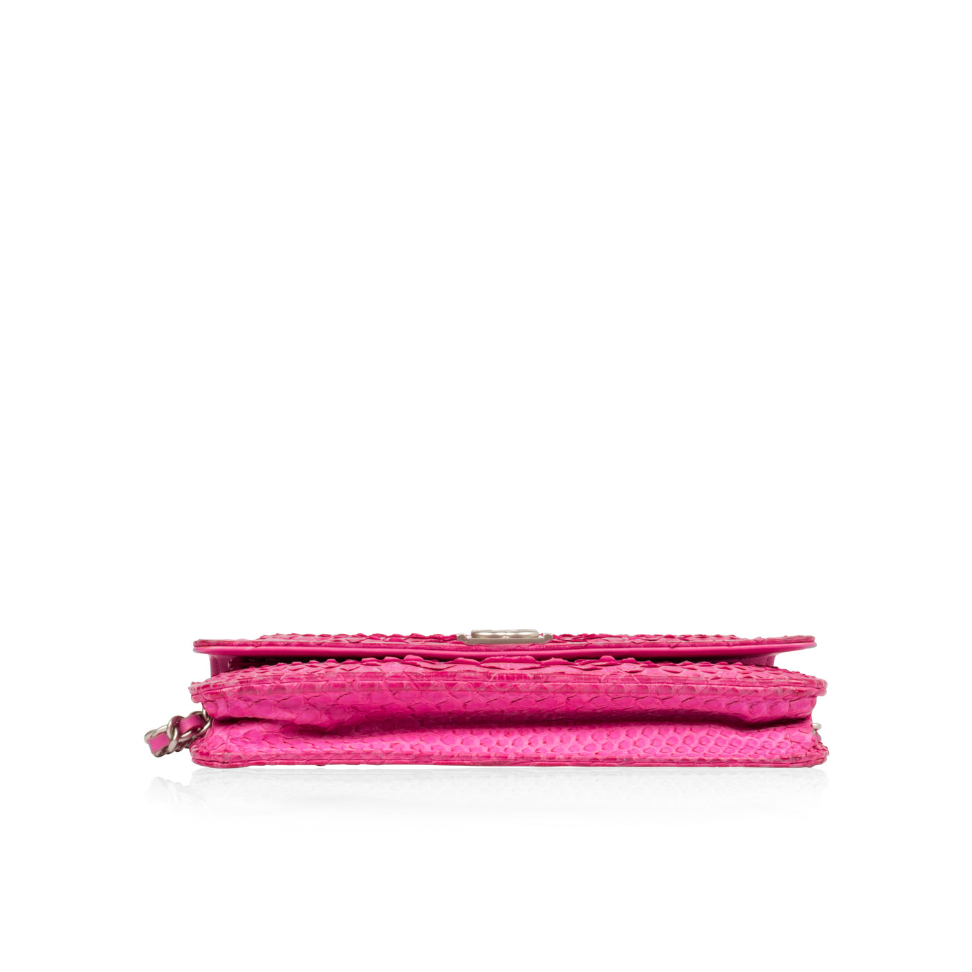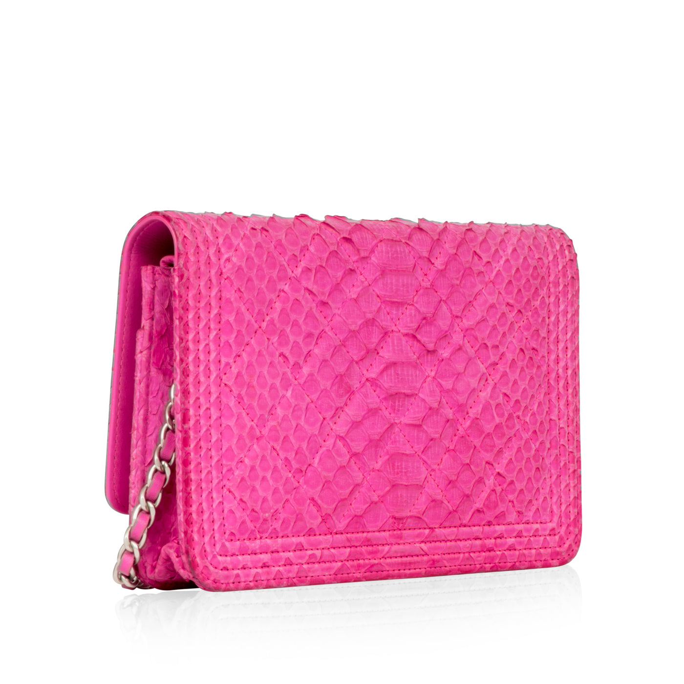 The Chanel Wallet On Chain is one of the most highly acclaimed accessories from the brand. Often seen in the smaller version of the Classic Flap, this particular piece is more or less the smaller version of the Boy bag. Sleek, stylish and sophisticated the WOC is a timeless accessory that you will have forever. Perfect for day-to-night usage, the Chanel WOC is for perfect accessory to hold all your small essentials. An easy, efficient bag you don't have to think about, this uber luxurious piece crafted from pink python leather is the ideal compliment anything in your wardrobe. A true must-have for any woman with a love for luxury, exotic skins, timepieces and Chanel in particular, this stunning little gem is a well-worthy addition to any handbag collection.