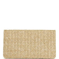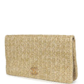 This Chanel CC Woven Clutch is in gold natural raffia fabric with antique gold hardware, featuring a quilted woven straw fold-over clutch bag with a front CC logo.