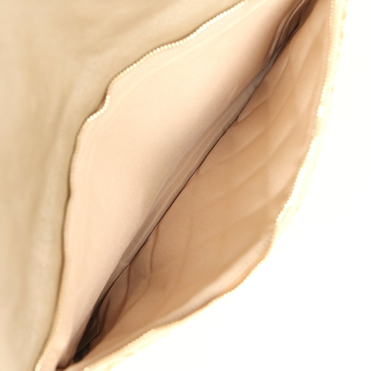 The interior is lined in gold metallic lambskin leather and beige grossgrain fabric and has two main zippered compartments.