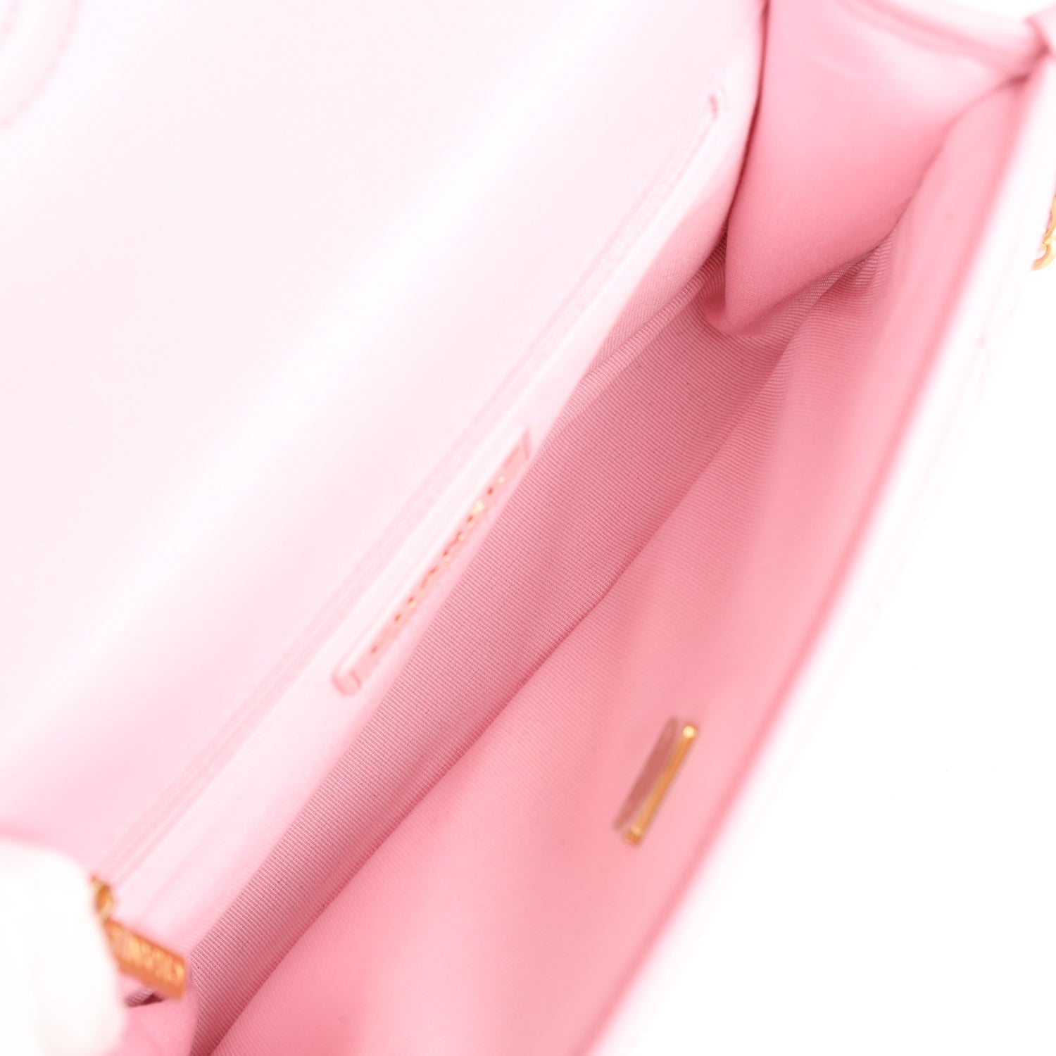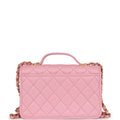 This Chanel School Memory Bag, is in pink quilted caviar leather with antique gold hardware, front flap with CC turnlock closure, back slip pocket, removable luggage tag, top handle and adjustable interwoven antique gold tone chain link and pink leather shoulder/crossbody strap.