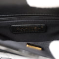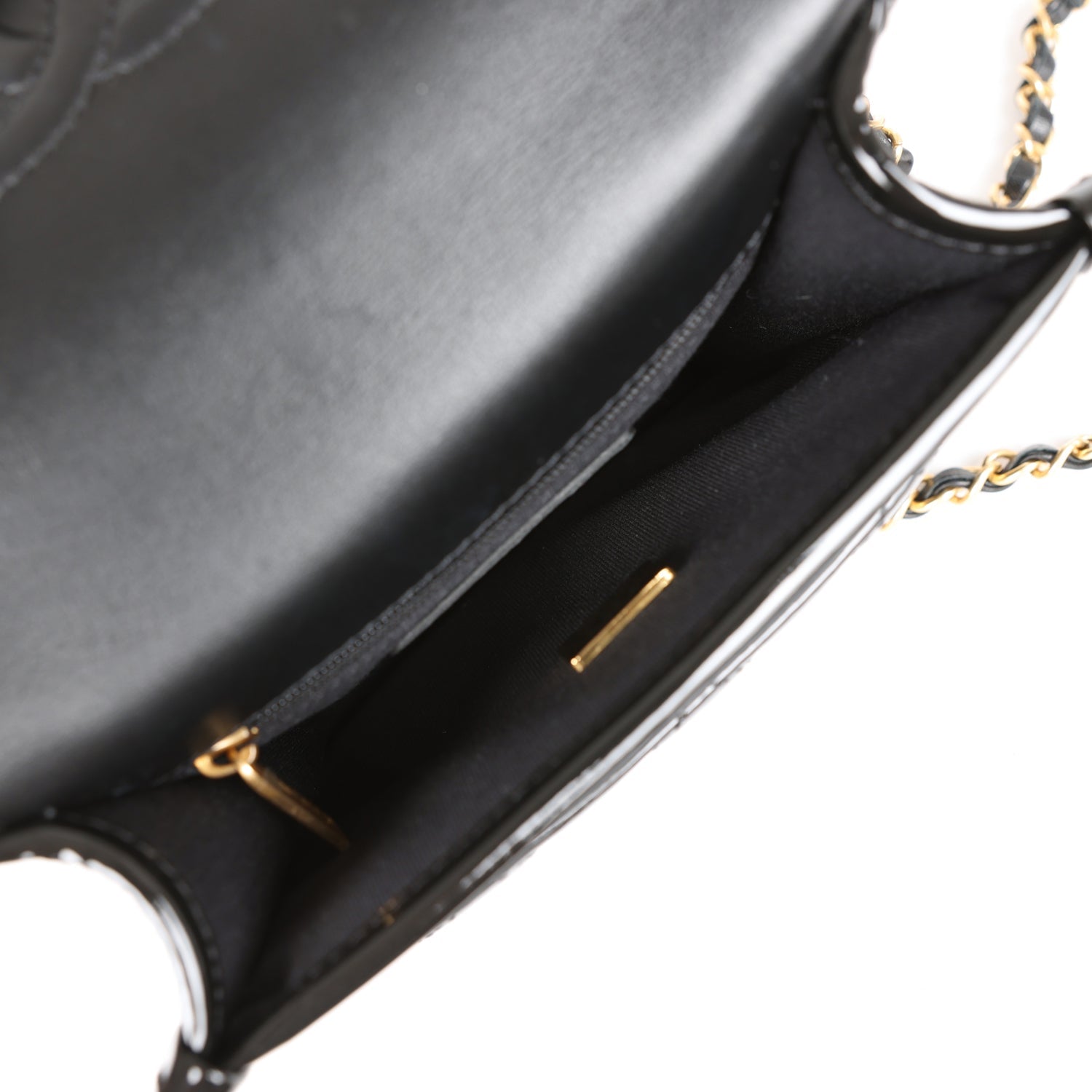 This School Memory Bag, is in black patent leather with antique gold hardware, front flap with CC turnlock closure, back slip pocket, removable luggage tag, top handle and adjustable interwoven antique gold tone chain link and black leather shoulder/crossbody strap.