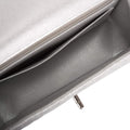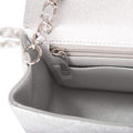 This Mini Rectangular flap bag is in silver metallic lambskin with silver tone hardware and has a front flap with signature CC turnlock closure, rear half moon pocket and single interwoven silver leather and silver tone chain link shoulder/crossbody strap.