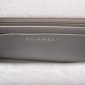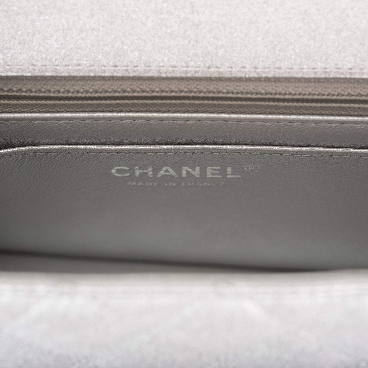 The interior is lined in silver leather and features a zipper pocket with Chanel pull and an open pocket below.