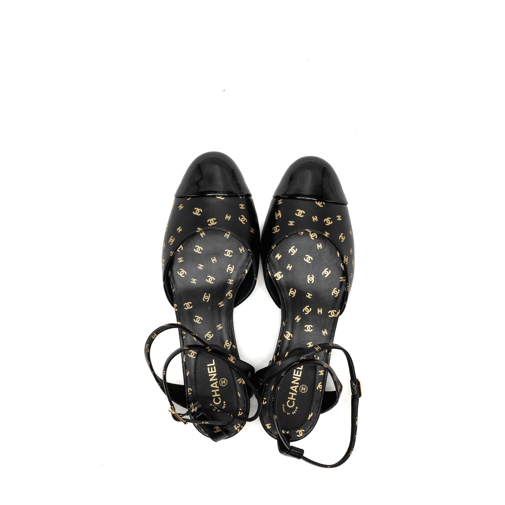 Chanel Size 37 CC Logo Print Slingbacks Lambskin/Patent Calfskin Black/Gold GHW