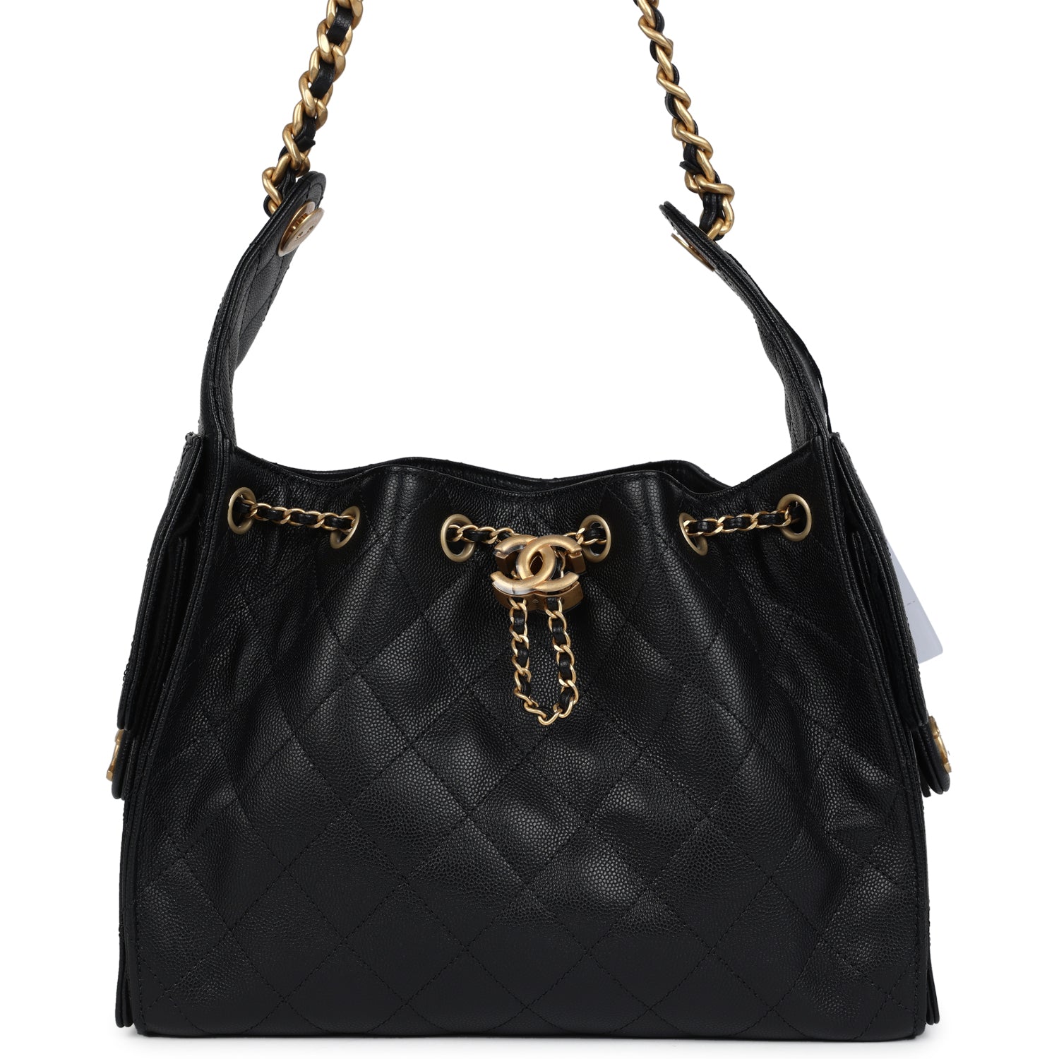 This Chanel Small 25 Hobo Bag is in black caviar leather with antique gold hardware, features signature diamond quilt, two exterior side pockets, drawstring closure, and a single interwoven antique gold and black leather shoulder strap.