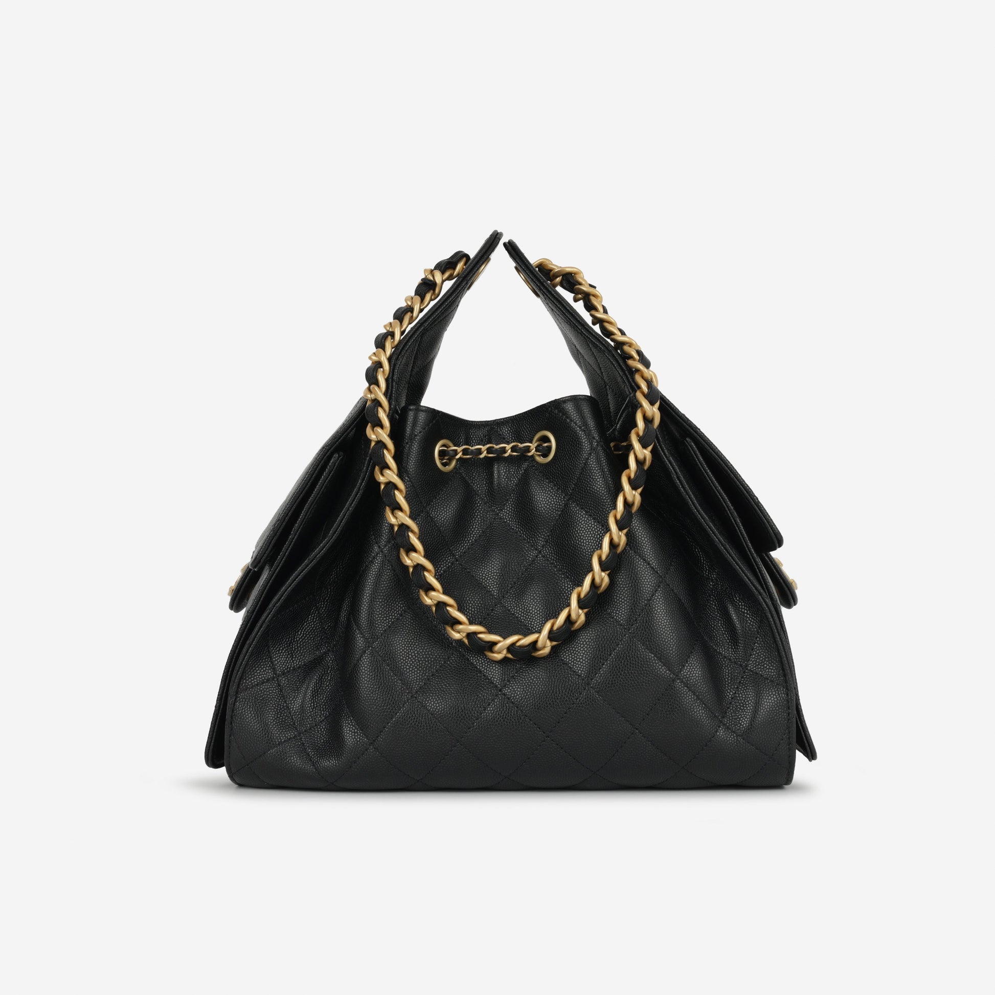 Crafted in Chanel’s iconic black caviar grained leather, renowned for its durability and luxurious texture, and finished with the signature gold-tone CC turn-lock closure. Available now at Prestige Totes.