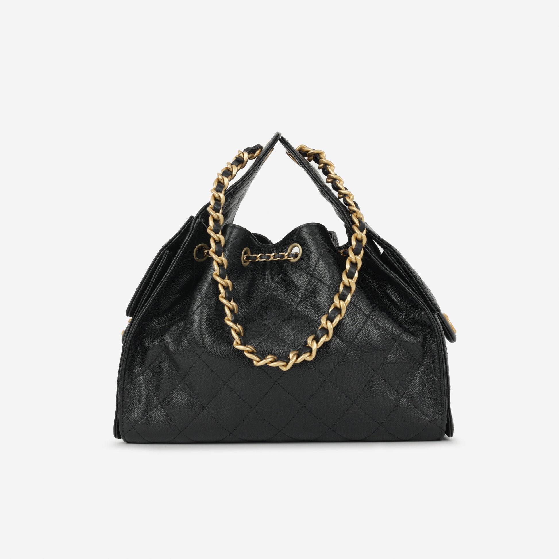 Crafted in Chanel’s iconic black caviar grained leather, renowned for its durability and luxurious texture, and finished with the signature gold-tone CC turn-lock closure. Available now at Prestige Totes.