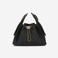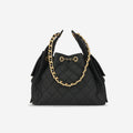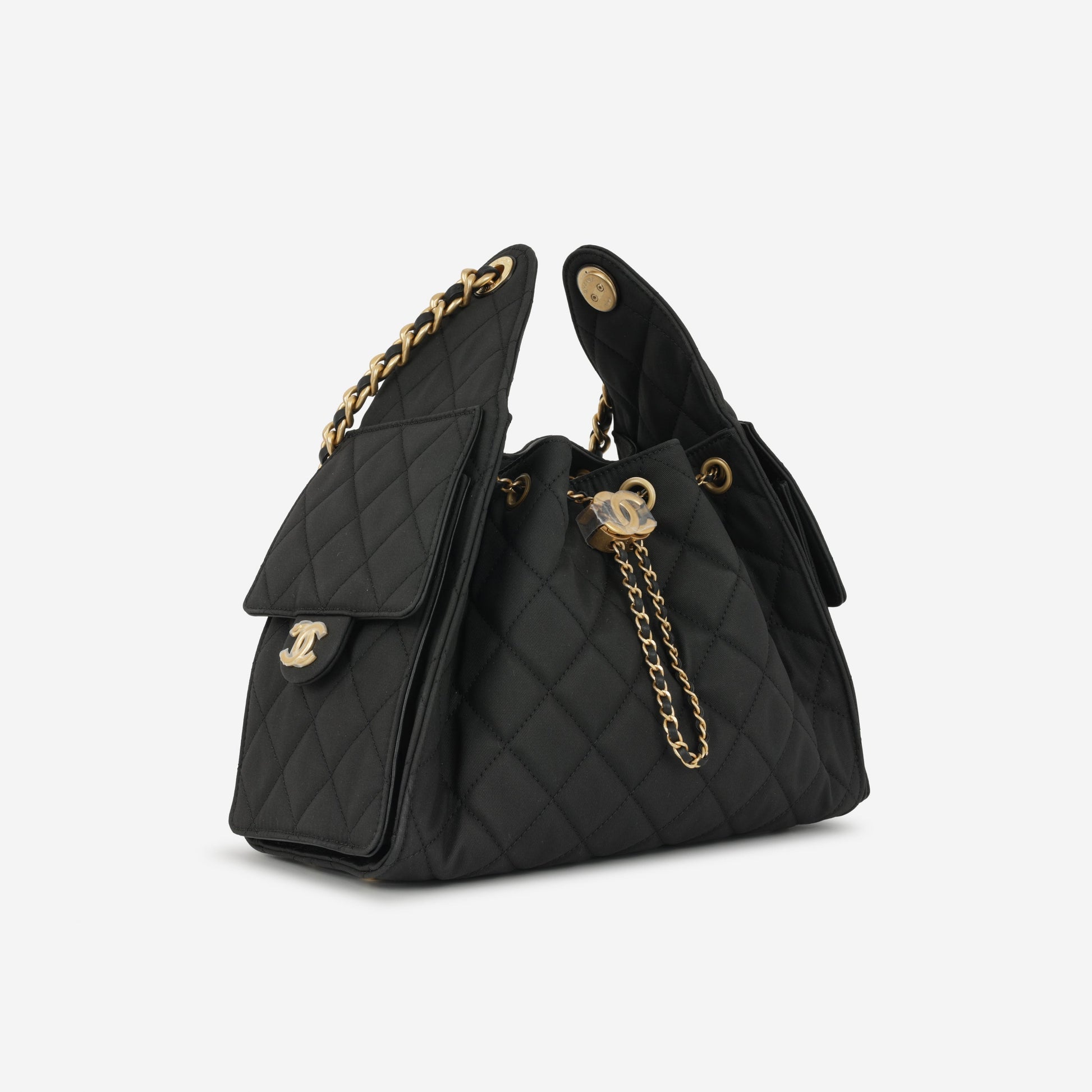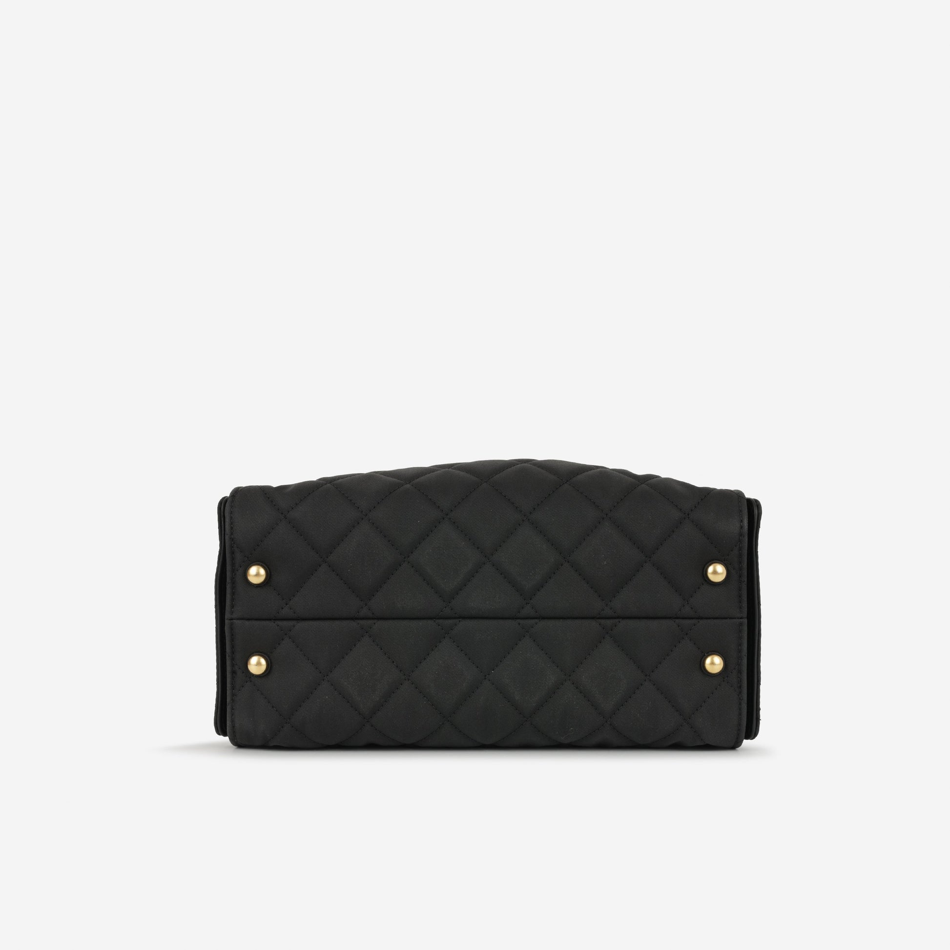 Crafted in Chanel’s sleek black coated canvas, known for its durability and contemporary finish, and completed with the signature gold-tone CC turn-lock closure. Available now at Prestige Totes.