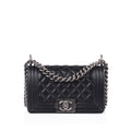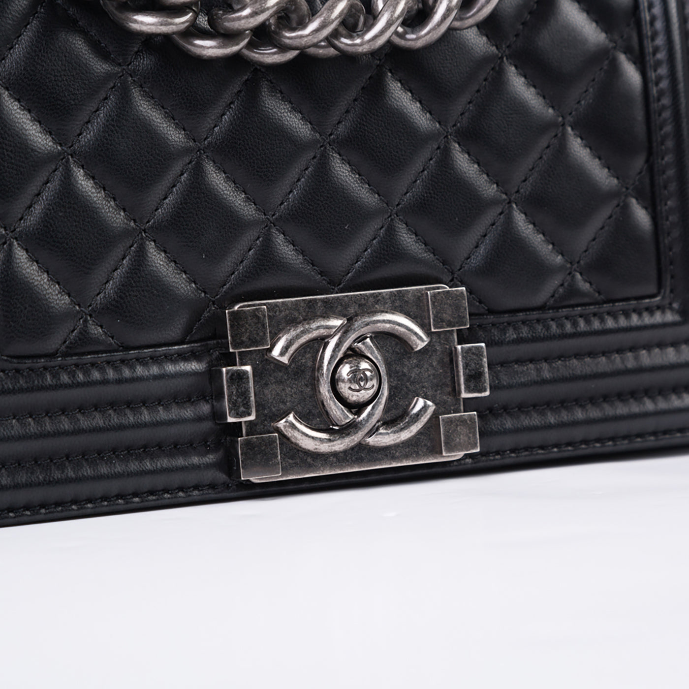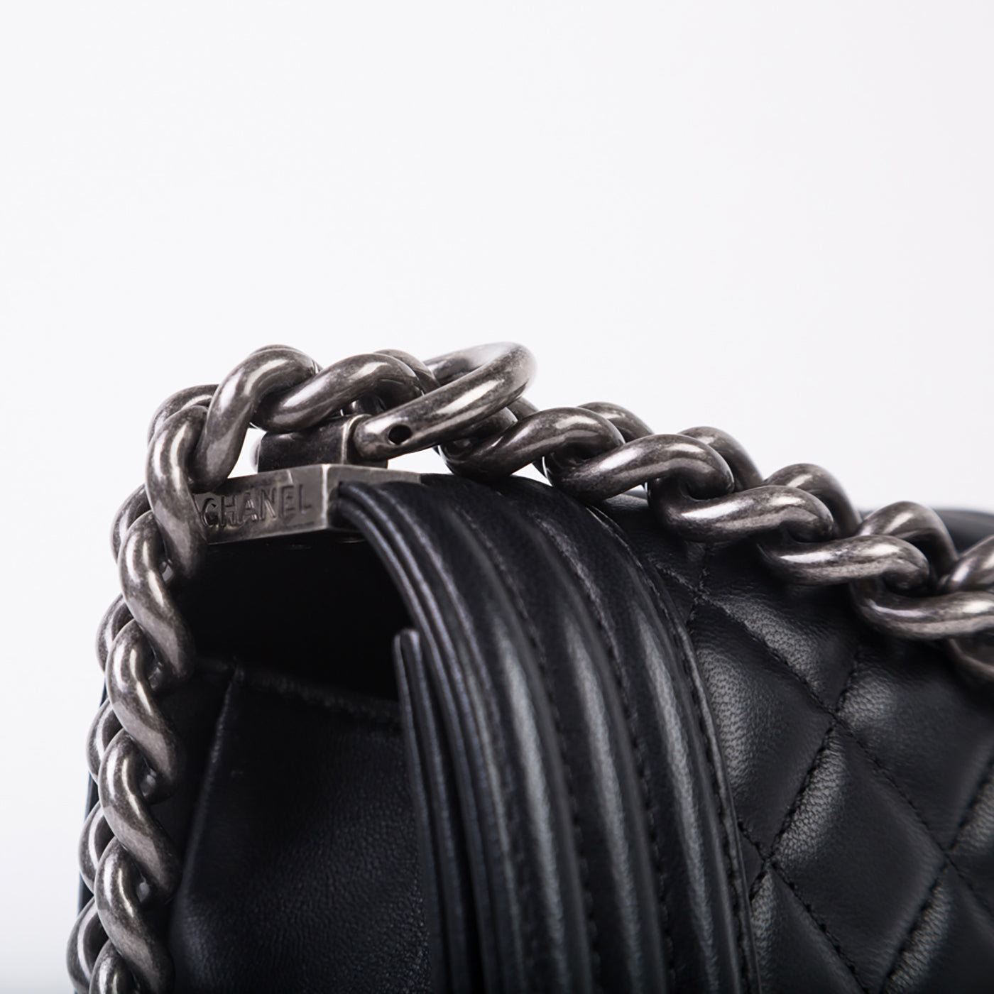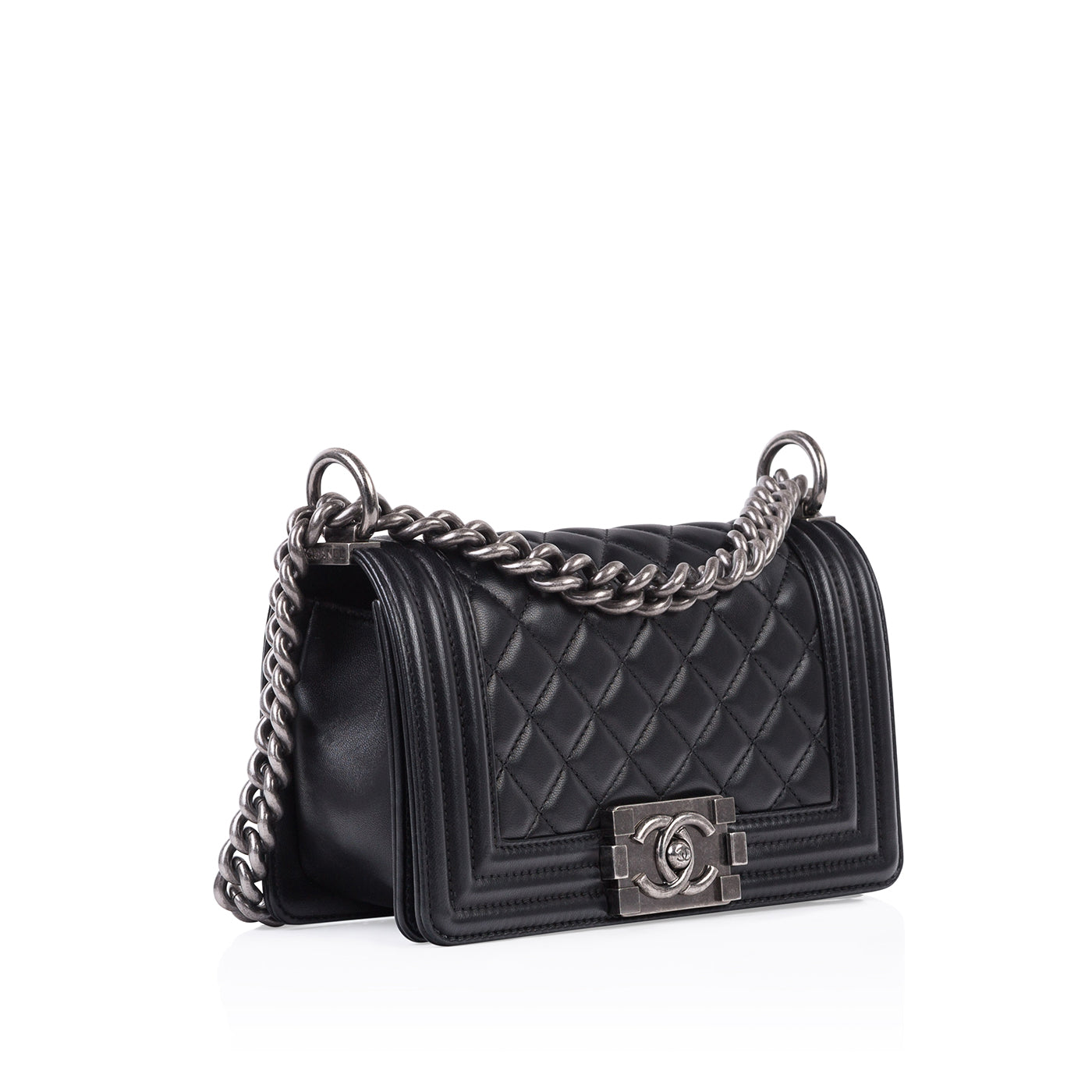 An absolute must-have for any fashion lover with a soft spot for Chanel. The Boy bag is not only an iconic piece that will remain in style forever, but it's the perfect balance between classic elegance and modern edge. Wear this bag with absolutely anything in your wardrobe, from casual jeans and a basic tee to a dressy skirt and blazer - you'll be sure to compliment any look with the Small Boy by your side. Carefully crafted from black quilted leather and ruthenium hardware, this bag is the ideal investment for any modern young woman with a fashion forward sense of style and a love for classic luxury.