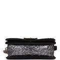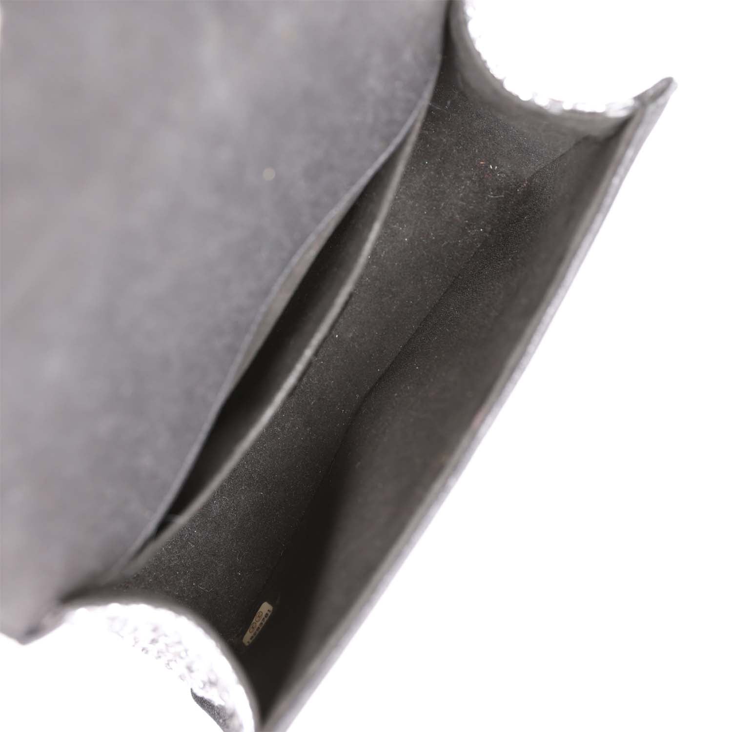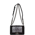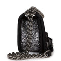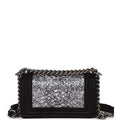 This Small Boy Bag is in Black Suede and Silver Python with silver hardware, Le Boy CC push closure, is rhinestone encrusted, has a silver chain and black leather/suede shoulder strap, and suede trim.