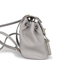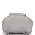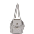 This Chanel Small Business Affinity Backpack is in light grey shiny grained calfskin leather with light gold tone hardware. This backpack features a small quilted leather zippered coin pocket on the front of the bag, cc turnlock closure and drawstring pull, one slit pocket on rear wall, small halfmoon pocket on back of bag, two adjustable light grey leather backpack straps.