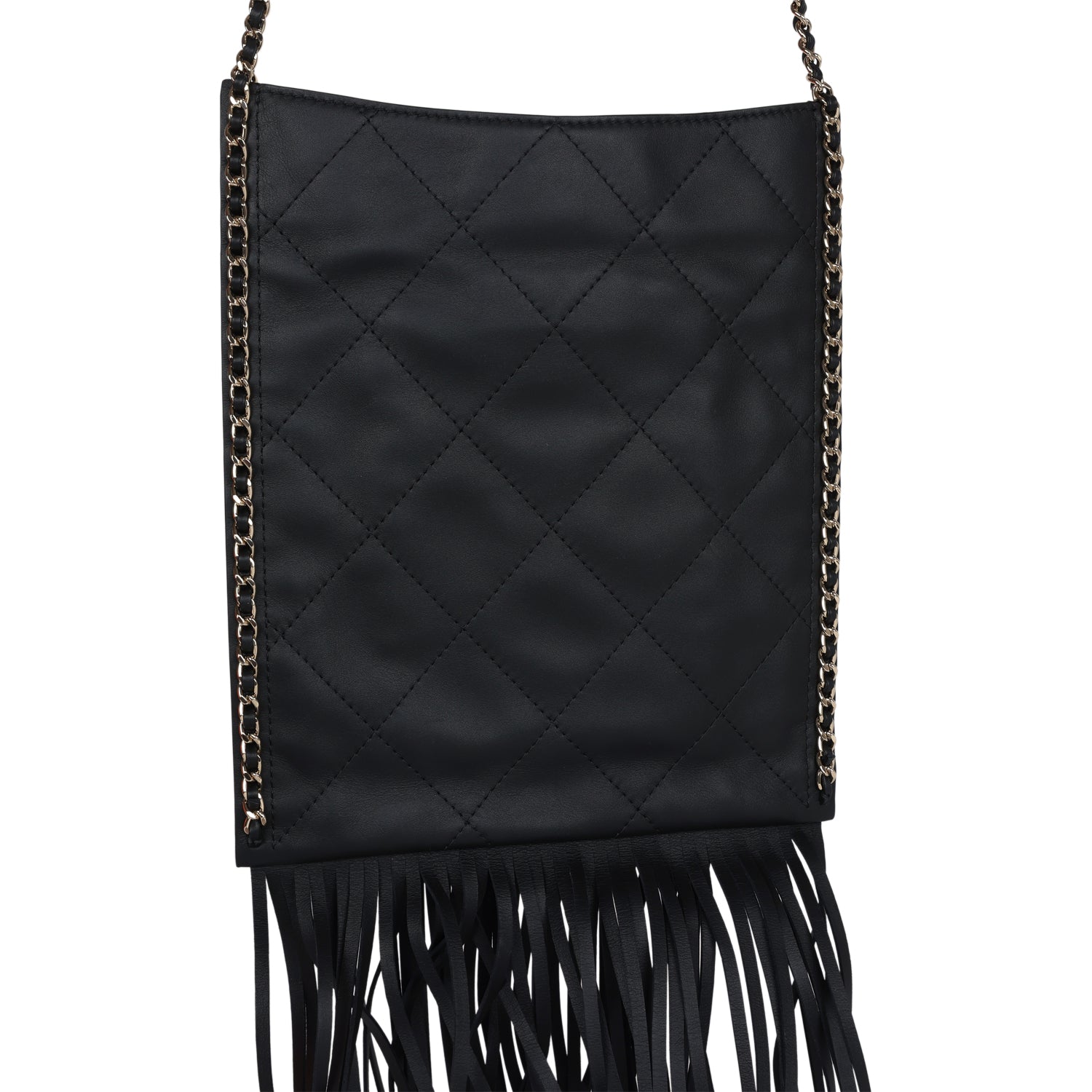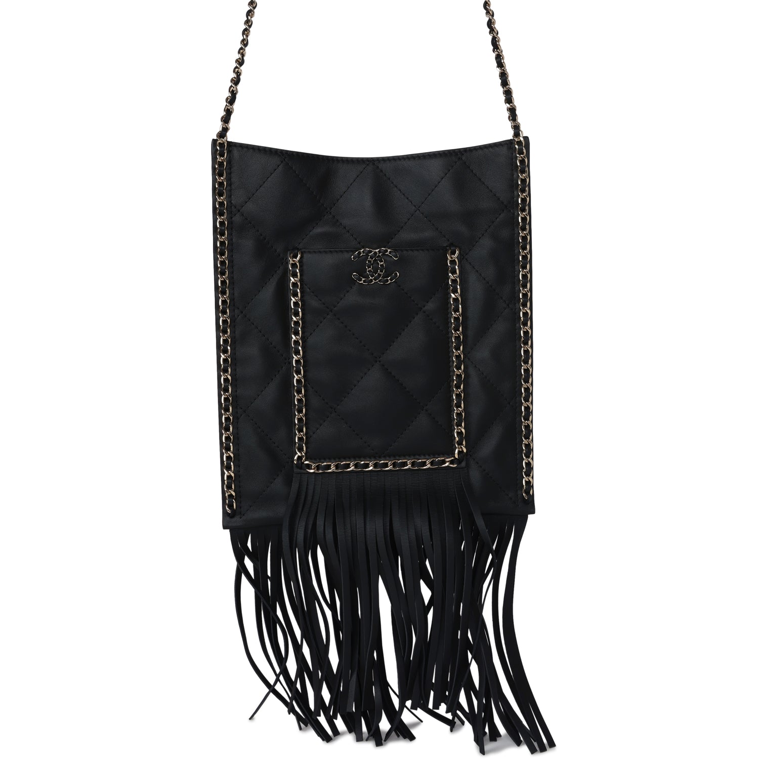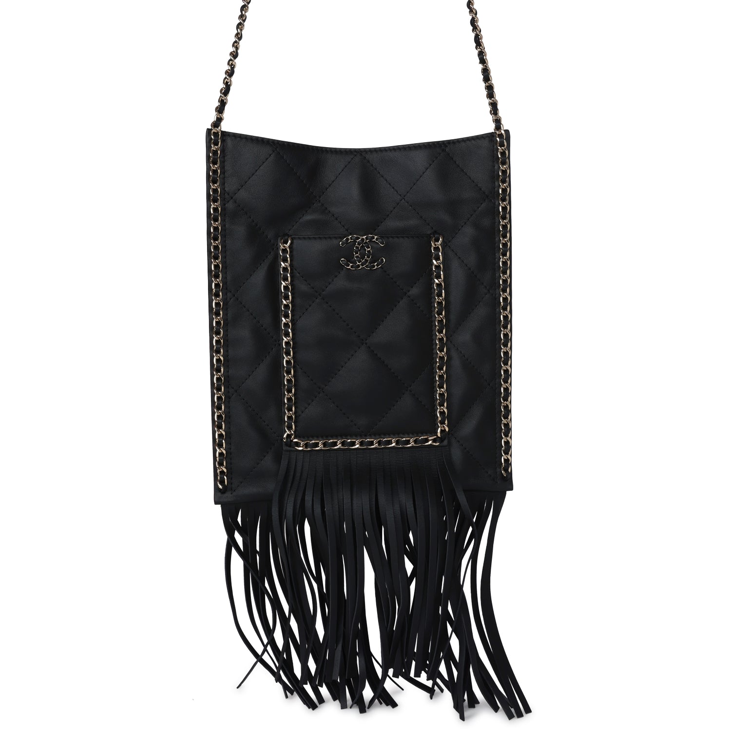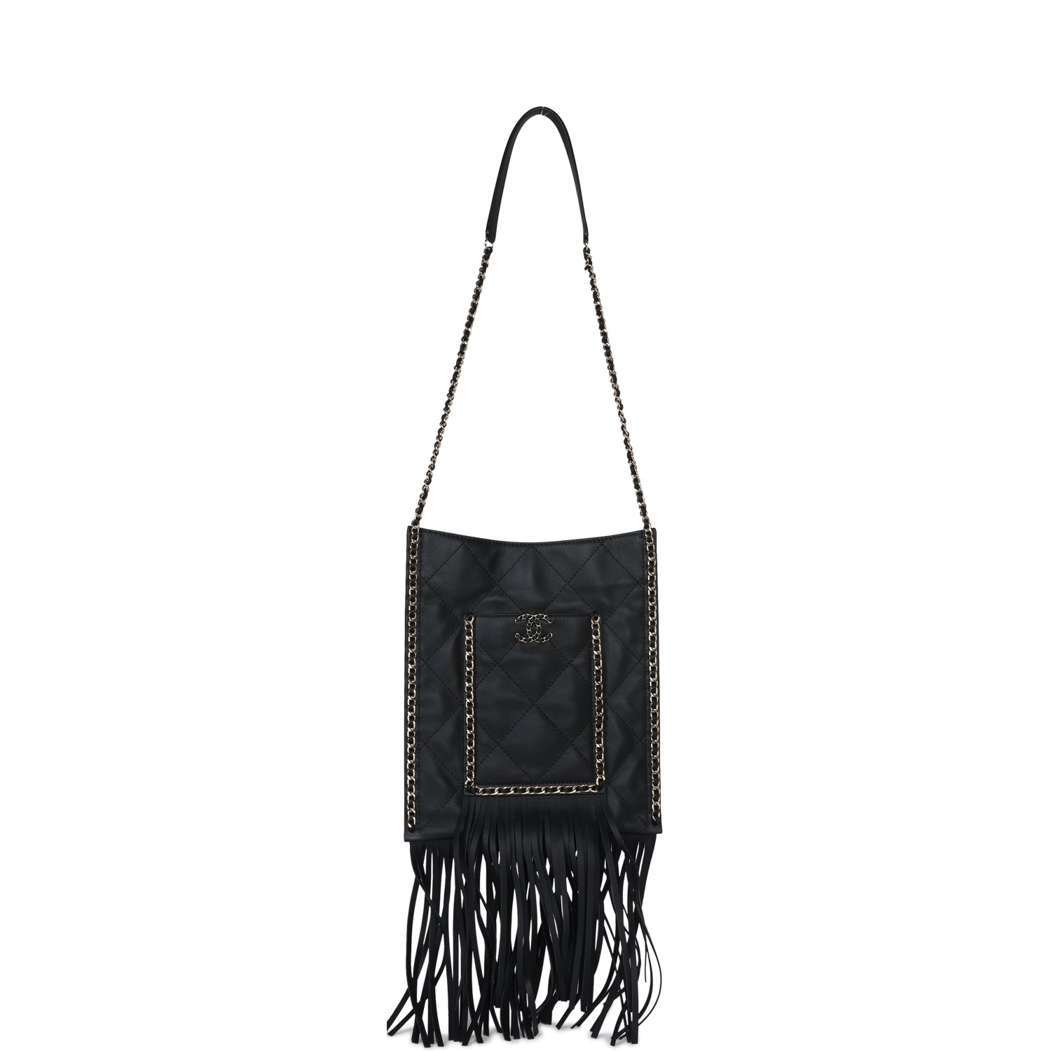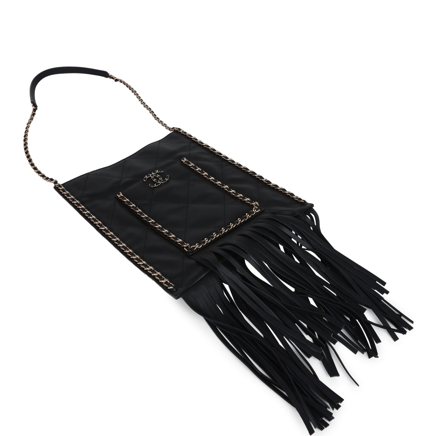 Chanel small CC fringe shopping bag is in black calfskin leather with light gold hardware, featuring a flat quilted tote, front pocket with interwoven leather and light gold hardware chainlink trimming with a matching CC logo on the front pocket, light gold chainlink and black leather trimming along the sides of tote with fringe on the ends of the front pocket and tote. It has a single interwoven light gold and black leather chain shoulder strap and a magnetic snap closure.