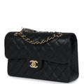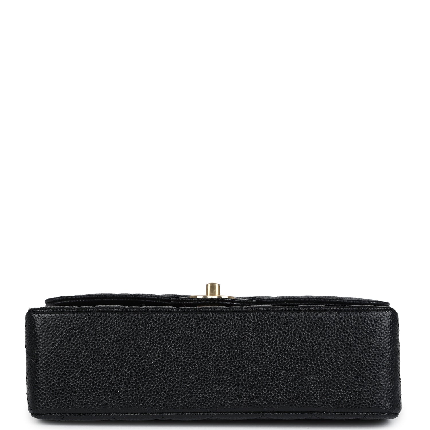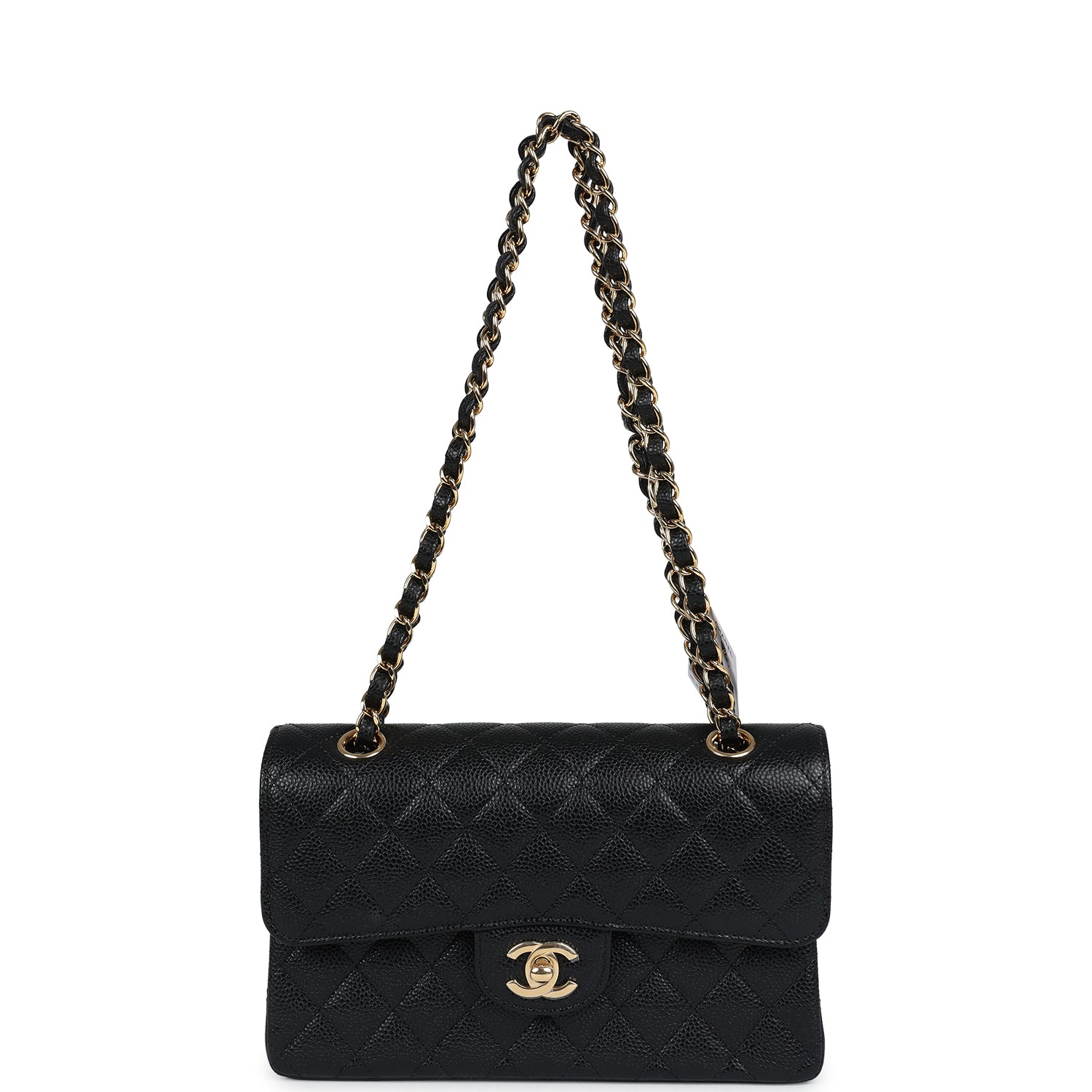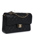 This Small Classic Double Flap Bag is in black caviar leather with gold tone hardware and features a front flap with signature CC turnlock closure, half moon back pocket, and adjustable interwoven gold tone chain link and black leather shoulder strap.